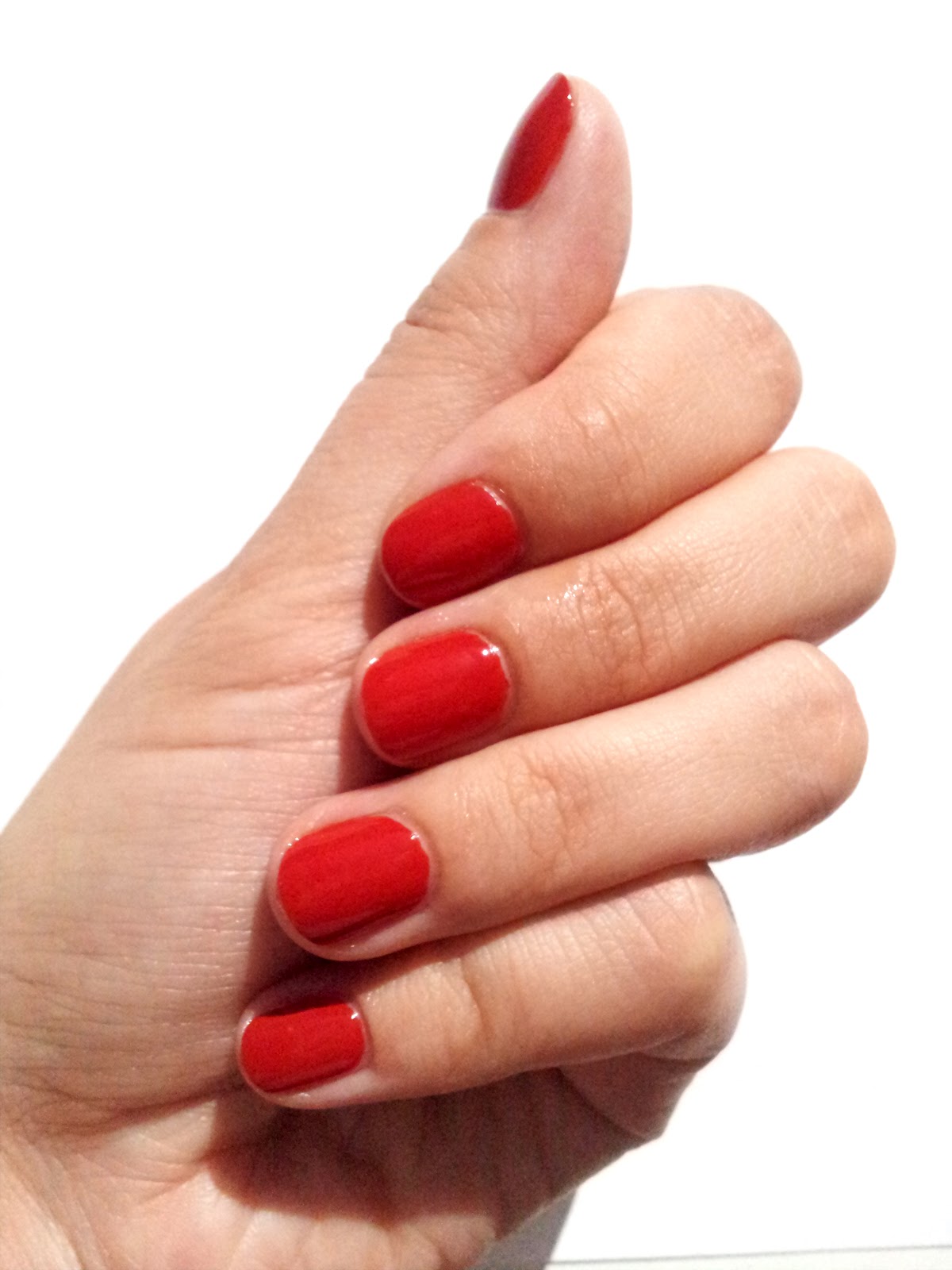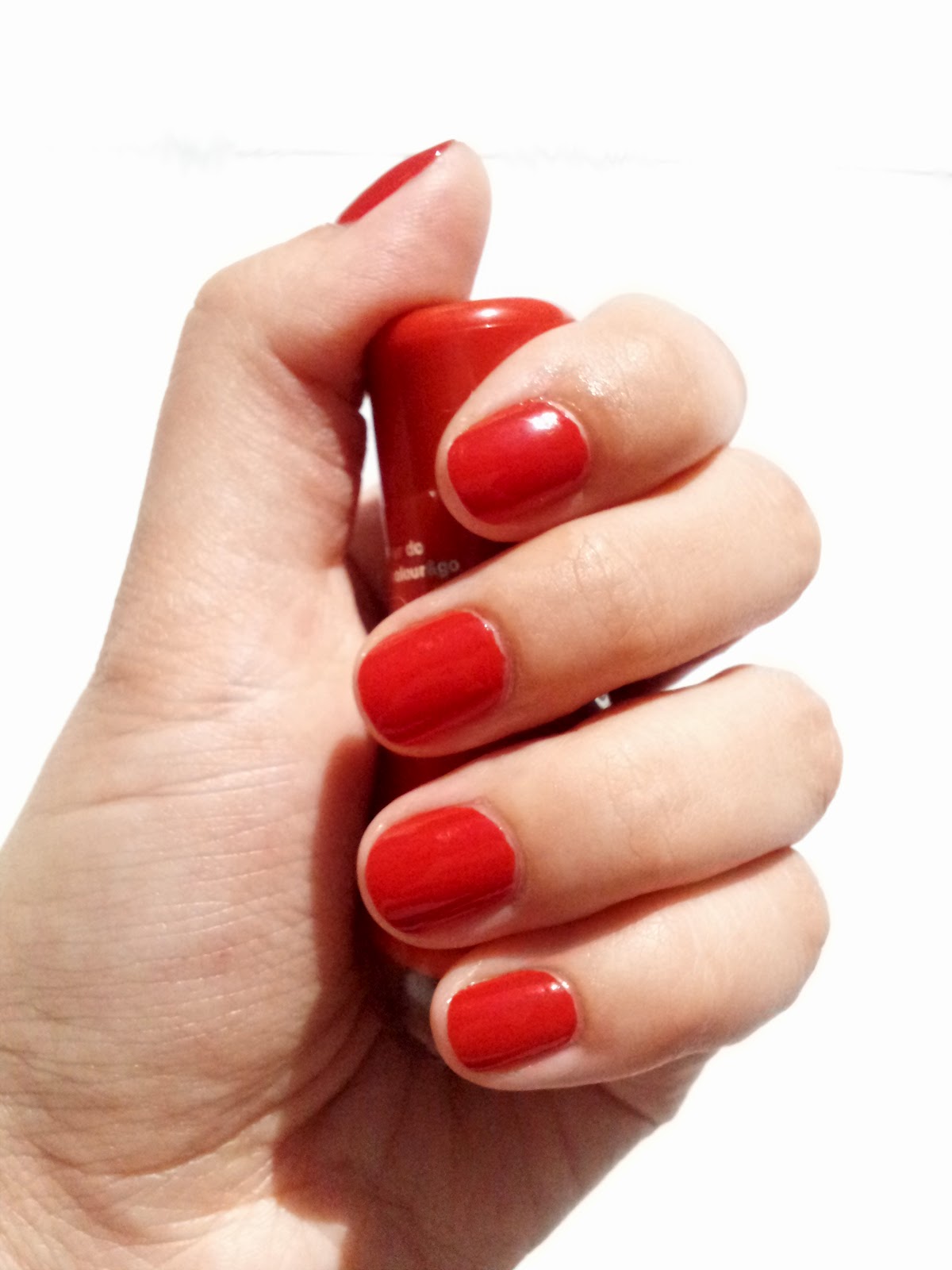 Szafa Essence obfituje w nowości wprowadzone na sezon jesień/zima 2012. Wśród nich znalazła się ulepszona gama lakierów Colour&Go, które mają charakteryzować się żelowym efektem, ultra szybkoschnącą formułą, wyjątkową trwałością i perfekcyjnym kryciem. Ulepszony został również design - lakiery zamknięte zostały w wygodnych wyprofilowanych buteleczkach, z nakrętkami w kolorze lakieru zamykanymi na "klik". Uroku dodaje wytłoczona literka "e" na wierzchniej części nakrętki. Zmienione zostały też pędzelki, nowe są szersze i wygodniejsze w obsłudze. Stare lakiery jakoś nigdy mnie nie kusiły, pomimo niskiej ceny i dość dobrych recenzji, więc kiedy pojawiła się zapowiedź nowości i zmian, po cichu liczyłam na coś interesującego. I znalazłam! Piękny kremowy pomidorowo-czerwony kolor o nazwie 117 i'm so very.