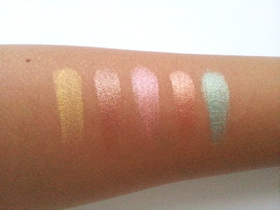 Wzięłam wszystkie pięć cieni, ponieważ po szybkim sprawdzeniu na dłoni, nie byłam w stanie się zdecydować na konkretne kolory. Wszystkie mi się strasznie spodobały, szczególnie miętowy o delikatnie metalowym połysku. Powiem szczerze, że nie żałuje ponieważ cienie mają świetną pigmentację i bardzo fajnie się ze sobą rozcierają.