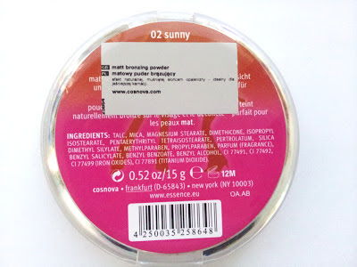 W ramach poszukiwania bronzera idealnego, za sprawą Mistrzyni Makijażu ;), w mojej kosmetyczce pojawił się Essence Sun Club Matt Bronzing Powder w odcieniu 02 sunny. Wybrałam odcień ciemniejszy ze względu na to, że wersja dla blondynek bardzo przypominała mi kolorystycznie produkt, który już posiadam.