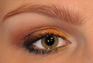 A tutaj moja propozycja makijażowa (zdjęcia robione w sztucznym świetle). Wykorzystałam cienie Gold Ribbon, Chocolate Penny, Truffle oraz Blue Spruce (na dolną powiekę).
