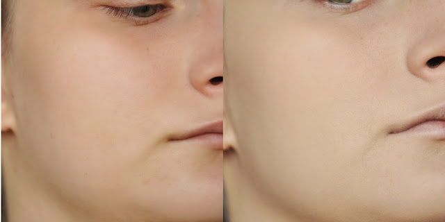 | Po lewej buzia bez makijażu, po prawej duet podkład + puder |
