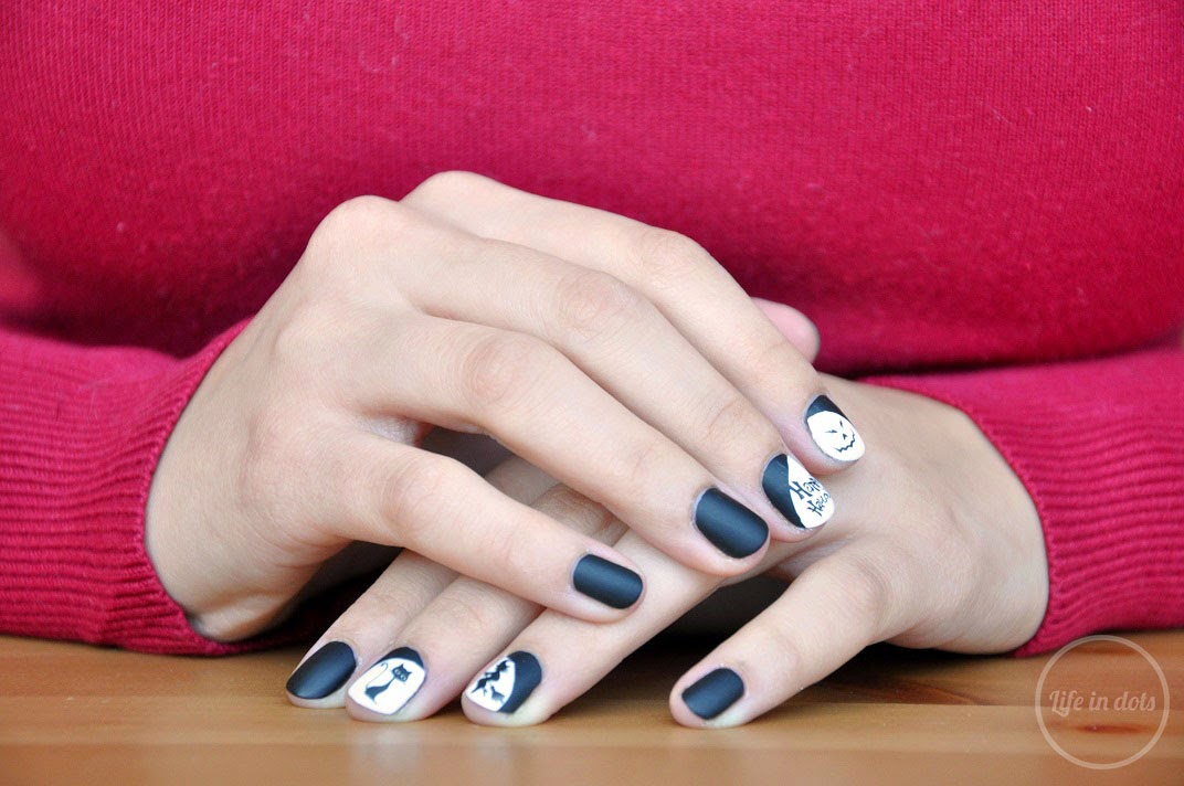 Wracając do tematu posta. Odbiegłam o standardowych kolorów związanych z Halloween, czyli dyniowej pomarańczy i krwistej czerwieni. Zdecydowałam, że lepiej postawić na dwa mocne kolory i kontrast, w związku z czym na paznokciach wylądowała czerń i biel bardziej w stylu Dziadów :P Do tego zabawne naklejki z cudnym kotem, czarownicą, dyniową buźką i napisem „Happy Halloween”. Całość pokryłam matującym topem, który sprawił, że paznokcie wyglądają znacznie bardziej elegancko. Powiem szczerze, że takie czarno-białe matowe połączenie bardzo mi przypadło do gustu i na pewno częściej będzie się pojawiało na moich paznokciach.