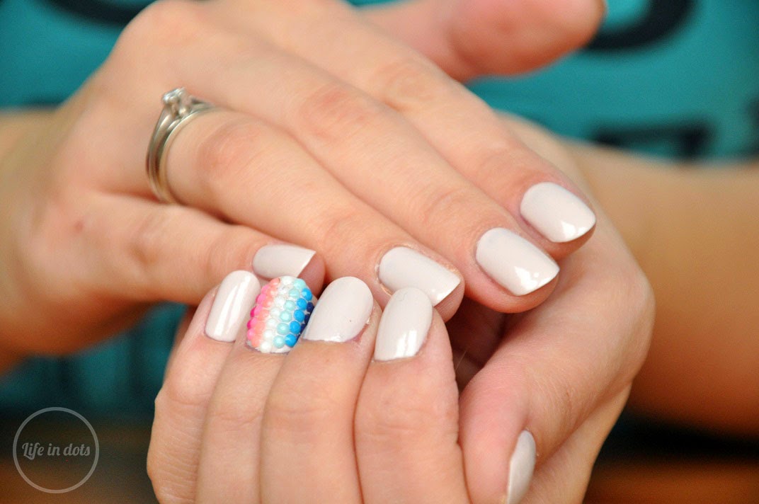 Kamyczki księżniczki ;) Czyli wykorzystałam różnokolorowe kamyczki/perełki/ćwieki/dżety do zdobienia ombre na całym jednym paznokciu ;) Dlaczego na jednym? Bardzo chciałam się przekonać jak będzie mi szła aplikacja, a także jak długo takie zdobienie będzie się trzymać na zwykłym lakierze. Do tego byłam zmęczona, więc zdobienie jest na jednym paznokciu. Ale za to ładne ;)