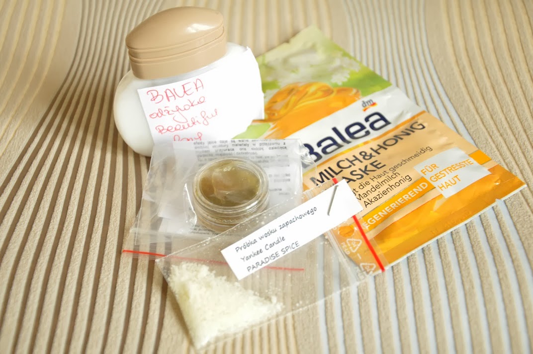 Ale to nie wszystko. Do zamówienia otrzymałam jeszcze kilka gratisów, które naprawdę mile mnie zaskoczyły. W paczce znalazłam próbkę odżywki Beautiful Long z Balea, próbkę Savon Noir z olejem lawendowym, próbkę wosku Yankee Candle Paradise Spice i pełnowymiarową maseczkę z mlekiem i miodem Balea.