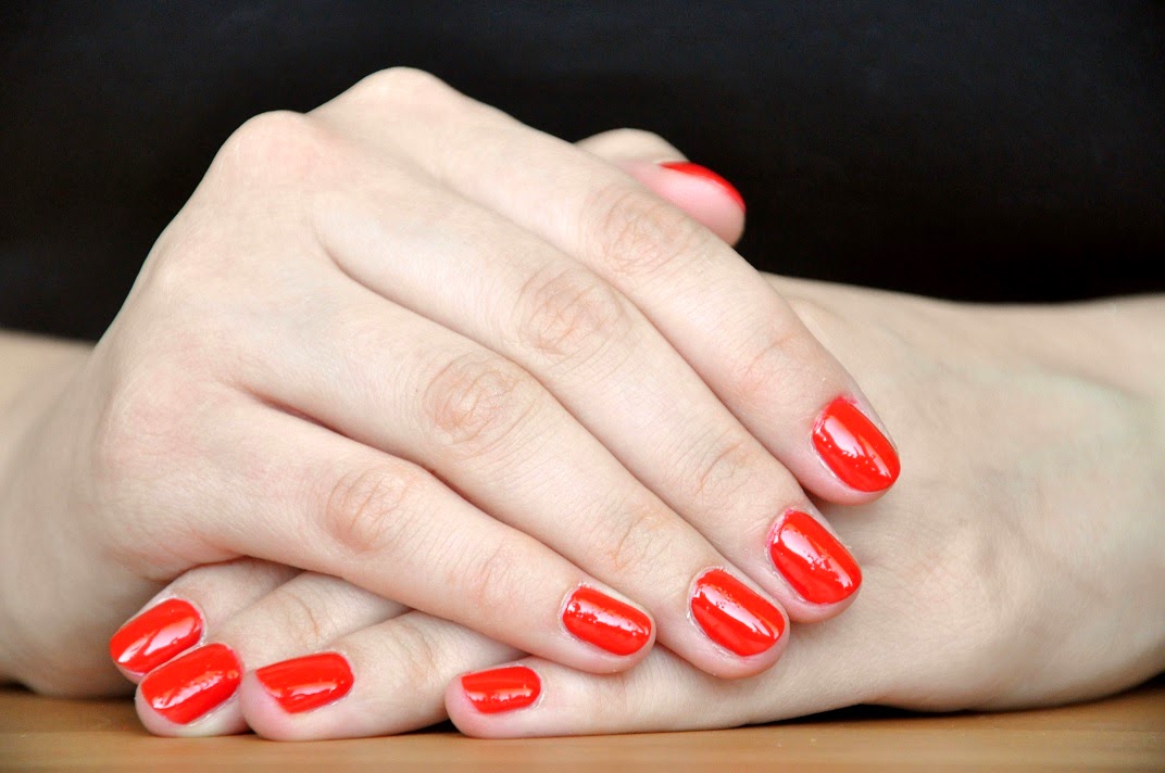 Pierwszym zaskoczeniem w tym lakierze był dla mnie wąski, skośnie ścięty pędzelek. Nigdzie nie znalazłam informacji, że ten typ tak ma i teraz zastanawiam się czy mój egzemplarz jest wybrakowany. Niestety tego typu pędzelkiem nie malowało się najwygodniej i na niektórych paznokciach zalały mi się skórki. Swoją drogą - proszę wybaczcie stan skórek, ale niestety moje dłonie ostatnio dużo przeszły, a do tego znowu stosuję NailTek. Ale staram się wyprowadzić dłonie na prostą. Wracając do tematu. Lakier ma konsystencję śmietany kremówki i świetnie kryje. W gruncie rzeczy po jednej warstwie paznokcie były na tyle równomiernie pokryte emalią, że zastanawiałam się czy pomalować następną warstwę. Ostatecznie pomalowałam dla pogłębienia pięknego koloru. 019 Venice to kolor, który naprawdę powala. Bardzo klasyczna i kobieca intensywna czerwień, taka czerwona jarzębina. Lakier schnie bardzo szybko na dość wysoki połysk. Niestety lakier bardzo mocno zbąblował, co widać na zdjęciach po przyjrzeniu się. Nie znalazłam żadnego paznokcia bez bąbelka, a przecież nie nakładałam grubych warstw.