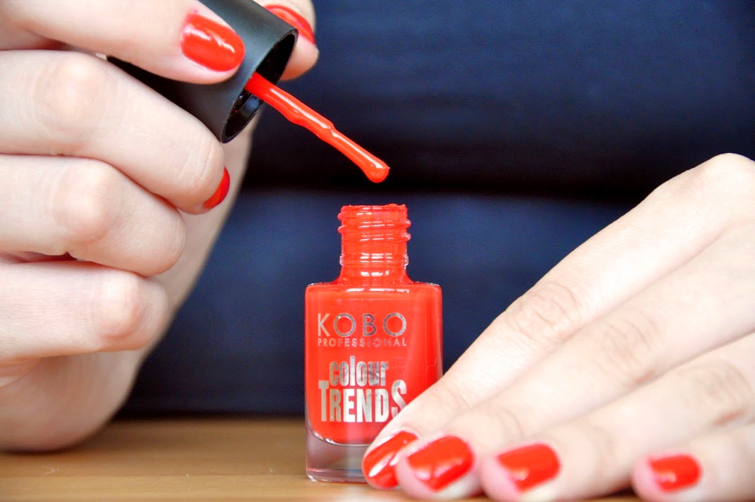 Dzisiaj klasycznie na czerwono, chociaż ten lakier wpadł mi trochę nie chcący. Kupując biały lakier do stempelków zauważyłam, że w Naturze jest promocja na lakiery, czyli kup jeden, weź drugi za 1 grosz. I jakoś tak, pamiętając o tym, że klasycznych czerwieni aktualnie u mnie brak, zdecydowałam się na wenecką propozycję Kobo z serii Color Trends. Pierwszą w moim zbiorach, bo firma ta jakoś mnie nie kusiła.