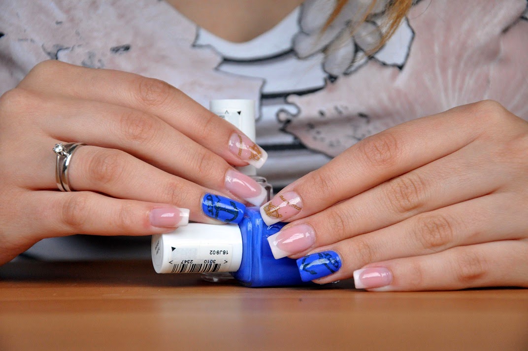 Naklejki, które wybrałam to wariacja na temat marynarskich lin, zegarków i koła sterowego. Na zdjęciach (tutaj) wyglądały naprawdę rewelacyjnie i spodziewałam się, że uzyskam co najmniej podobny efekt. Naklejki są naprawdę bardzo delikatne, ale niezbyt trudne w obsłudze. Wystarczy wyciąć wzór z kartonika, zamoczyć w wodzie przez 10-20 sekund, a następnie przyłożyć do paznokci, osuszyć i pokryć topem. Żadna filozofia. Zdecydowałam, że chciałabym sprawdzić wygląd naklejek na jasnej i ciemnej bazie, dlatego paznokcie na palcach serdecznych pokryłam lakierem Butler Please. Możecie po zdjęciach domyślić się, że zadowolona nie jestem. Bardzo słaba pigmentacja sprawia, że na frenchu obrazek jest bardzo niewyraźny, zaś na niebieskim praktycznie niewidoczny. Do tego naklejka ściąga się i rozmazuje przy nakładaniu topa (widać to szczególnie na lewej dłoni). Oczekiwałam fajnego efektu, ale słaba jakość skutecznie go popsuła. Póki co mówię naklejkom „nie”.