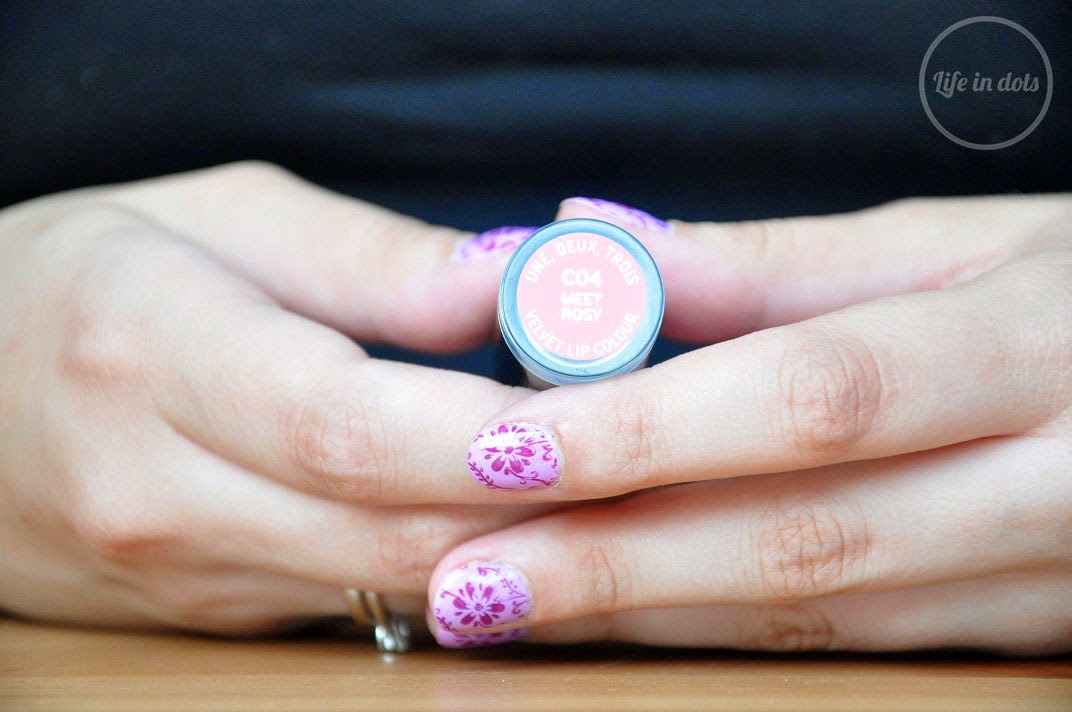 Poznajcie Rosy. Jedną z dziewczyn Catrice, która pojawiła się w limitce „Un, deux, trois” dostępnej w sieci Hebe. Rosy ma trzy wcielenia – lakieru, różu i pomadki, ale tylko ostatnie z nich skradło moje serce na tyle, bym zdecydowała się je zabrać do domu.