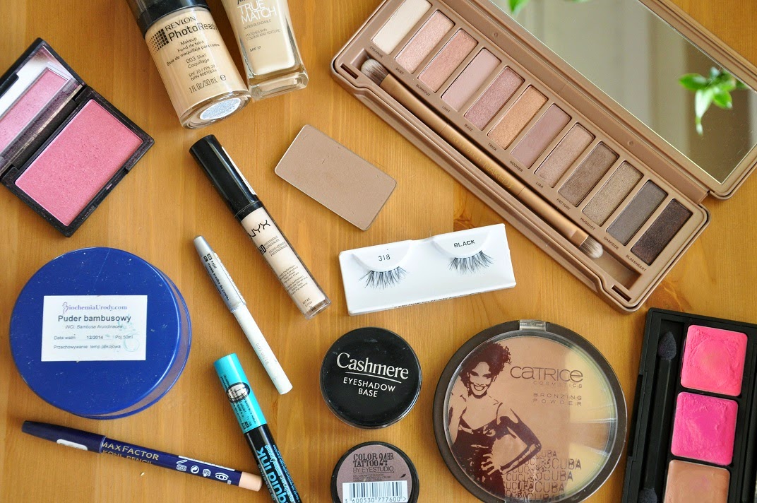 Do makijażu oczu użyłam: bazy pod cienie Cashmere Dax Cosmetics, białej kredki Essence, palety Naked 3 (cienie Strange, Dust, Butnout, Limit, Buzz i Blackheart), kredki Max Factor 090 Natural Glaze na linię wodną, tuszu do rzęs Clinique High Impact, cienia Color Tattoo 40 Permanent Taupe do brwi. Dla podkreślenia zewnętrznego kącika przykleiłam połówki rzęs Ardell 318.