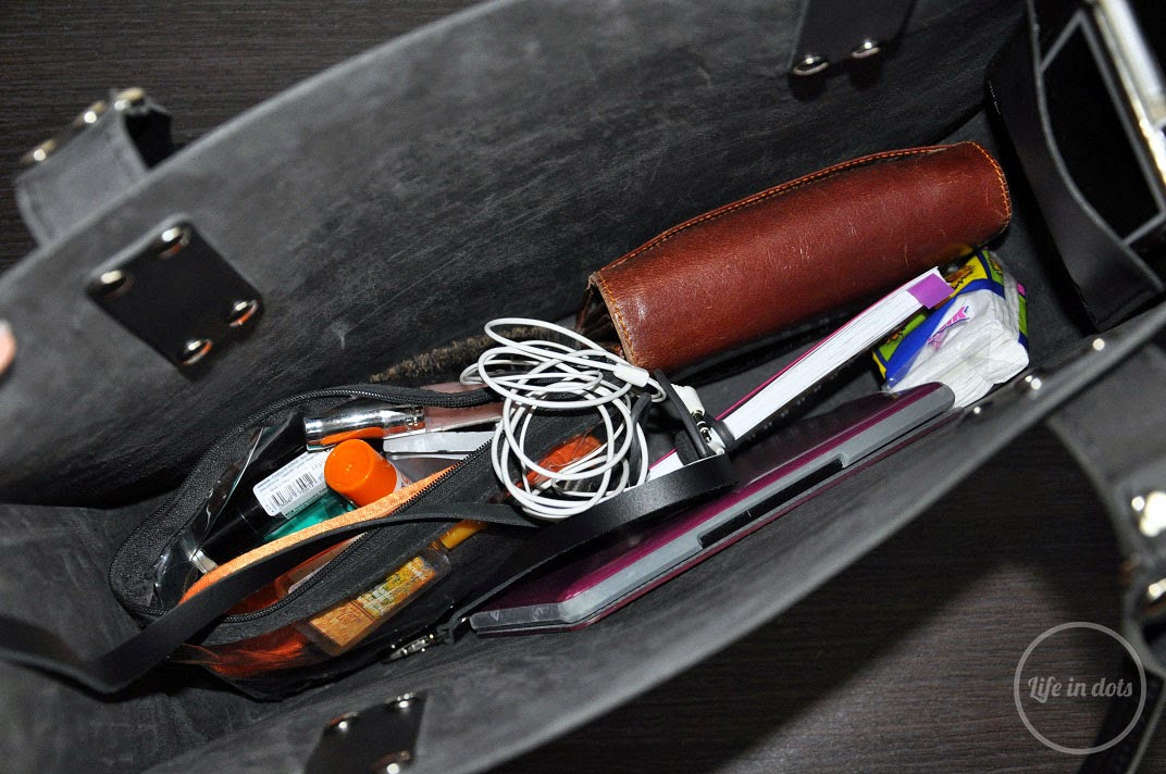 Zamówiona przeze mnie torba to model HOR_SATIN, czyli czarna, sztywna, pozioma o wymiarach 39x34x11. Powiem szczerze, że bałam się czy nie wzięłam za małej i zastanawiałam się nad zmianą na model większy. Dobrze, że tego nie zrobiłam, bo torba jest absolutnie ogromna. Zmieściłam tam 3 wielkie książki językowe, zeszyt, piórnik, portfel, kosmetyczkę i jeszcze był luz. Jest to model jednokomorowy bez suwaka. Wiem, że podniosą się głosy, że taka torba jest mało użyteczna i ktoś nas może okraść. To właśnie powiedziała moja mama, gdy pokazałam jej Dzikiego Józefa. Tak, niezbyt bezpieczna jest niezamykana torba, ale ja żadnej nie zamykam, czy ma suwak czy nie. Po prostu nie lubię zamykać torebki. Z resztą nie wyobrażam sobie jak złodziej miałby mi wsadzić rękę do tak wielkiej torby bez zostania zauważonym przez kogokolwiek. Model, który wybrałam posiada jeszcze kieszeń na telefon oraz bardzo przydatną smycz na klucze. Kieszeń rozmiarowo jest idealna na mojego Samsunga Galaxy S2, ale podejrzewam, że większe modele miałyby problem, żeby się zmieścić.