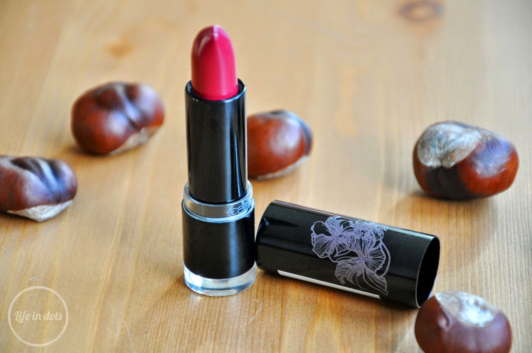 Red Butler to absolutnie przepiękny, kremowy odcień winnej czerwieni o delikatnie szarawo-niebieskich tonach idealny na jesień. Odcień, który sprawia, że zęby wydają się optycznie bielsze. Pomadka jest bardzo dobrze napigmentowana i kremowa, dlatego fantastycznie się ją aplikuje. Nie robi smug, plam, nie wchodzi w załamania na ustach i nie podkreśla suchych skórek. Bardzo dobrze się też utrzymuje, chociaż to mało powiedziane. W ostatnią sobotę miałam ją na ustach od 12 do 18 z małymi poprawkami i dodatkiem pomadki nawilżającej wklepanej z wierzchu, ponieważ po 4 godzinach zaczęłam odczuwać mały dyskomfort związany ze ściągnięciem skóry.