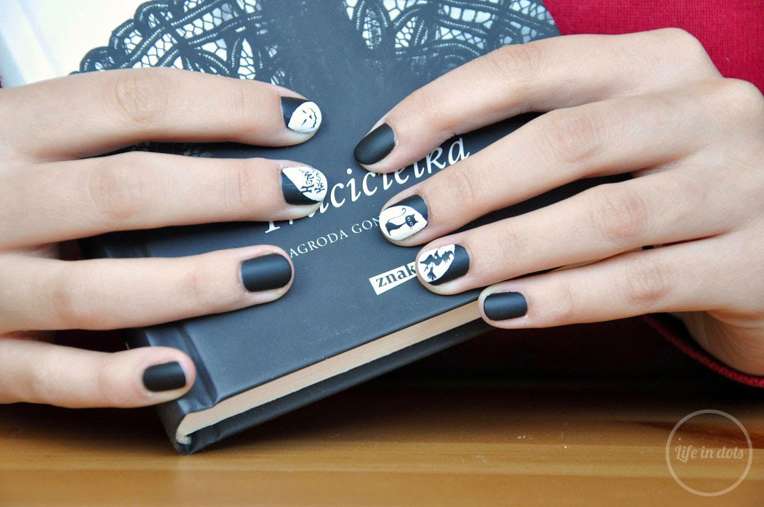 Wracając do tematu posta. Odbiegłam o standardowych kolorów związanych z Halloween, czyli dyniowej pomarańczy i krwistej czerwieni. Zdecydowałam, że lepiej postawić na dwa mocne kolory i kontrast, w związku z czym na paznokciach wylądowała czerń i biel bardziej w stylu Dziadów :P Do tego zabawne naklejki z cudnym kotem, czarownicą, dyniową buźką i napisem „Happy Halloween”. Całość pokryłam matującym topem, który sprawił, że paznokcie wyglądają znacznie bardziej elegancko. Powiem szczerze, że takie czarno-białe matowe połączenie bardzo mi przypadło do gustu i na pewno częściej będzie się pojawiało na moich paznokciach.