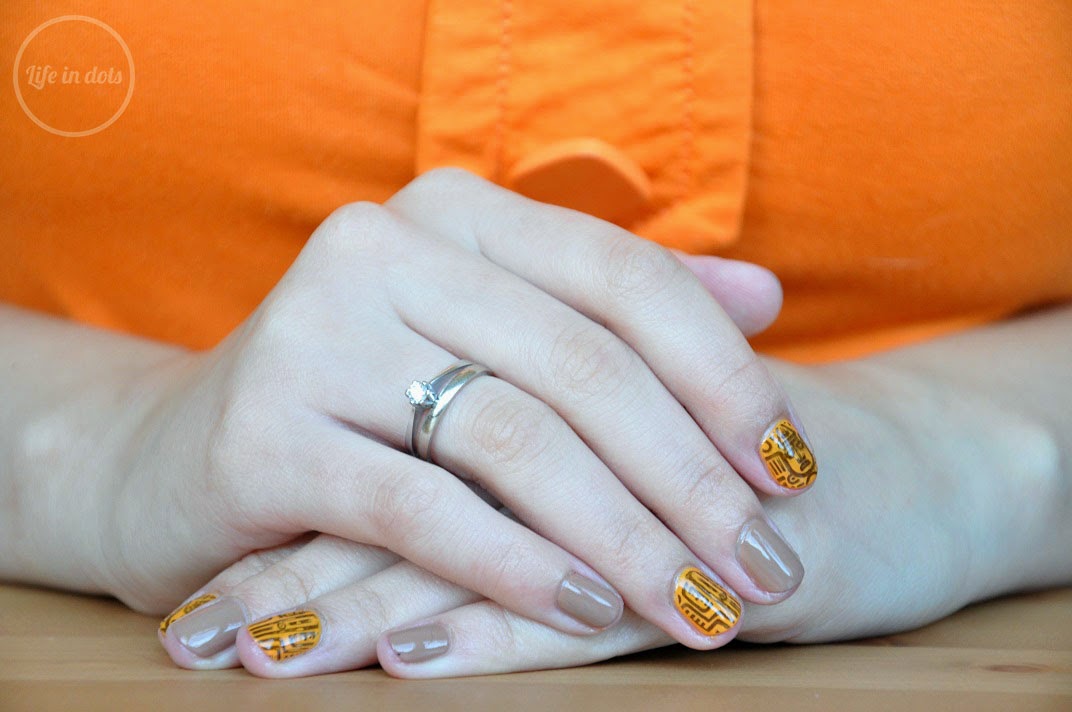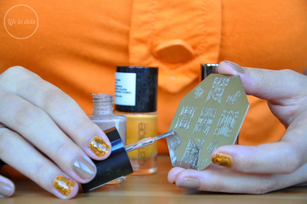 Do wykonania zdobienia użyłam dwóch lakierów ze starej limitki Catrice – Cucuba. Lakiery to 01 Sunny Side (żółty) i 04 Havana Drum (brąz). O ile z żółtym się nie specjalnie lubię i wykorzystuję go tylko do zdobień, to brąz należy do jednych z moich ulubionych lakierów ;) Do wykonania stempli użyłam lakieru Golden Rose Rich Color numer 35. Takie połączenie kolorystyczne nie tylko pasuje do azteckich wzorów, ale również do jesieni za oknem.