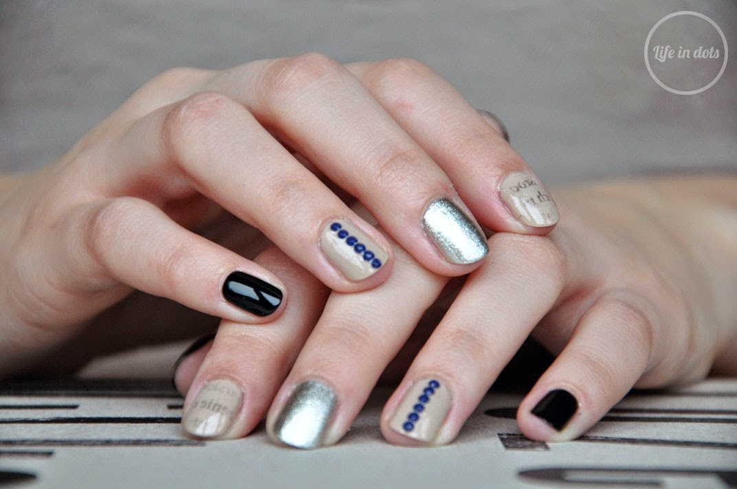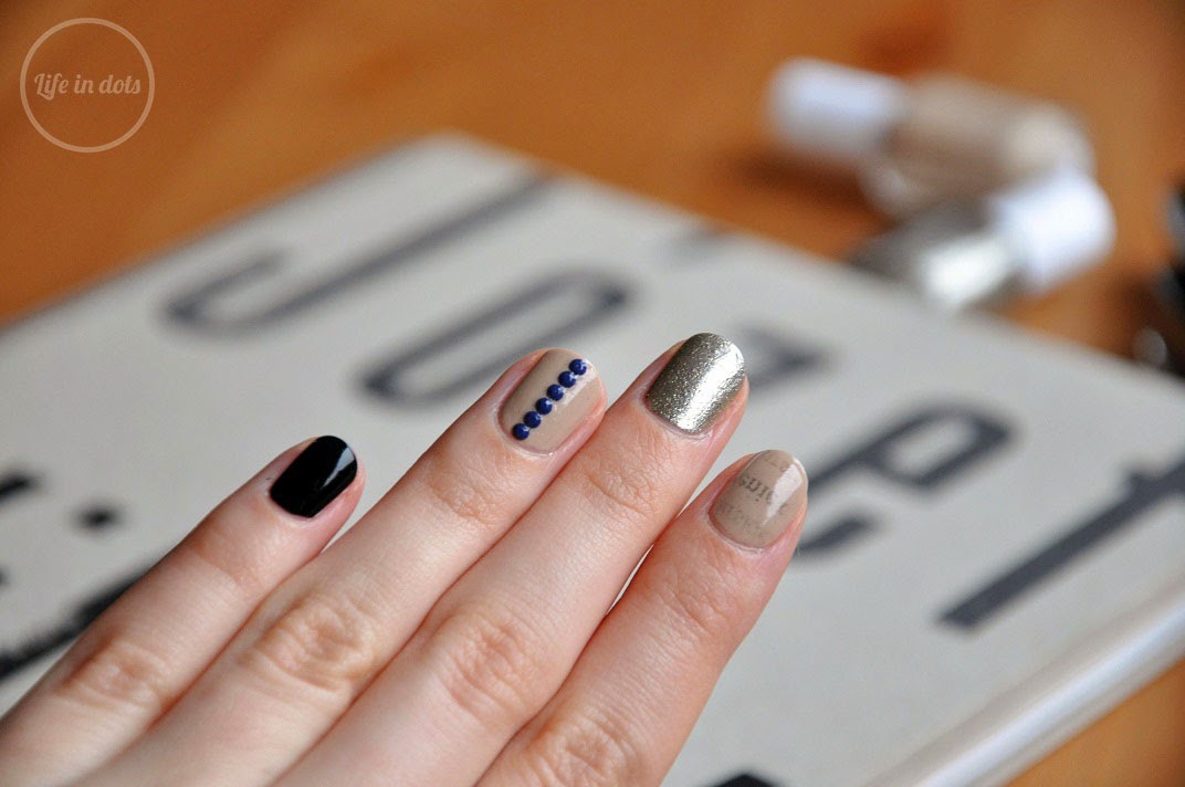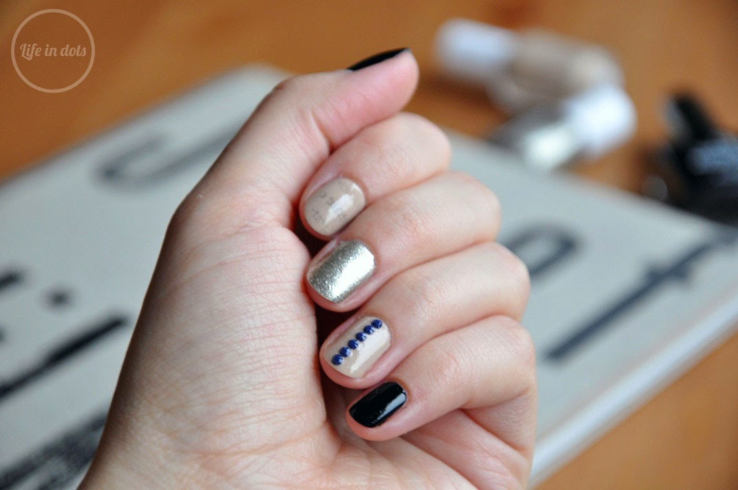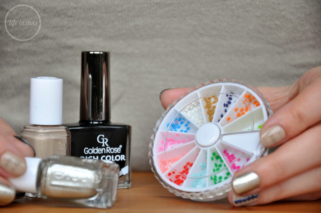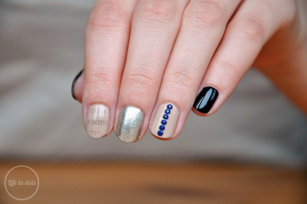 Do wykonania zdobienia użyłam trzech lakierów – Golden Rose Rich Color 35, Essie Coctails & Coconuts oraz Essie Jiggle Hi Jiggle Low. Na wskazującym palcu mam gazetowe zdobienie, które wykonywałam po raz pierwszy, a na serdecznym przykleiłam kilka ćwieków z karuzelki BPS.
