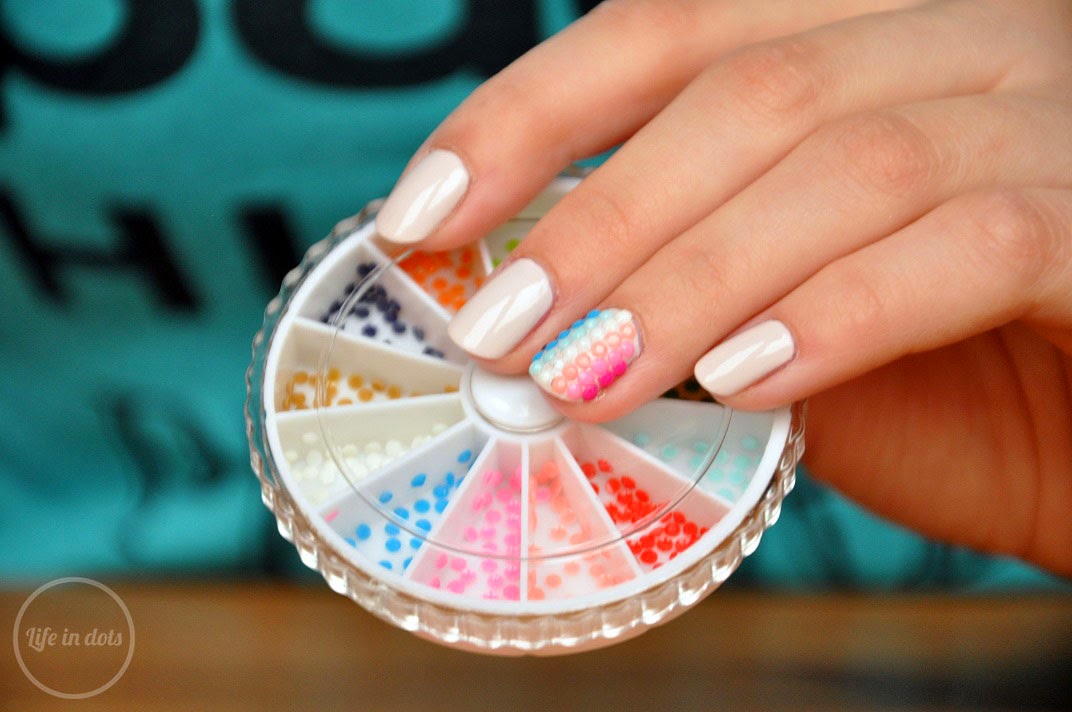 Kamyczki księżniczki ;) Czyli wykorzystałam różnokolorowe kamyczki/perełki/ćwieki/dżety do zdobienia ombre na całym jednym paznokciu ;) Dlaczego na jednym? Bardzo chciałam się przekonać jak będzie mi szła aplikacja, a także jak długo takie zdobienie będzie się trzymać na zwykłym lakierze. Do tego byłam zmęczona, więc zdobienie jest na jednym paznokciu. Ale za to ładne ;)