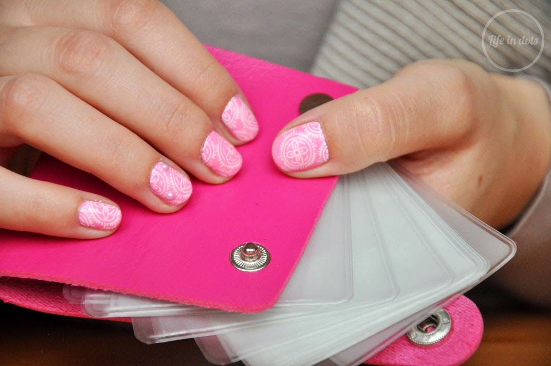 Do wykonania zdobienia posłużyłam się neonowo różowym lakierem Essie - Boom Boom Room, płytką do wzorków BornPrettyStore, którą pokazywałam Wam tutaj oraz perełkami z karuzeli BPS. Przy okazji tego zdobienia chciałabym Wam też pokazać w czym przechowuję swoje całe 4 (!) płytki ;) Różowe etui z ekoskóry zapinane na zatrzask kryje w sobie 12 podwójnych koszulek na płytki. Łącznie można w nim schować 24 pasujące płytki, które dostępne są w ofercie BornPrettyStore. Etui jest bardzo porządnie wykonane i wbrew pozorom bardzo przydatne. Niestety niefortunnie płytka, którą wykorzystałam do mikołajkowego zdobienia uległa wypadkowi. Zaklinowała się w mojej drewnianej szufladce na przybory do paznokci i wzór uległ starciu. Na szczęście, głupim trafem, doszła do mnie zaginiona paczka, w której miałam taką samą płytkę (bardzo mi na niej zależało, dlatego zamówiłam drugi raz :P). Teraz trzymam płytki w etui i mam gwarancję, że nic im się nie stanie, a żadna z nich się nie zgubi. Do tego etui jest bardzo poręczne i niewielkie, dzięki czemu nie zajmuje dużo miejsca.