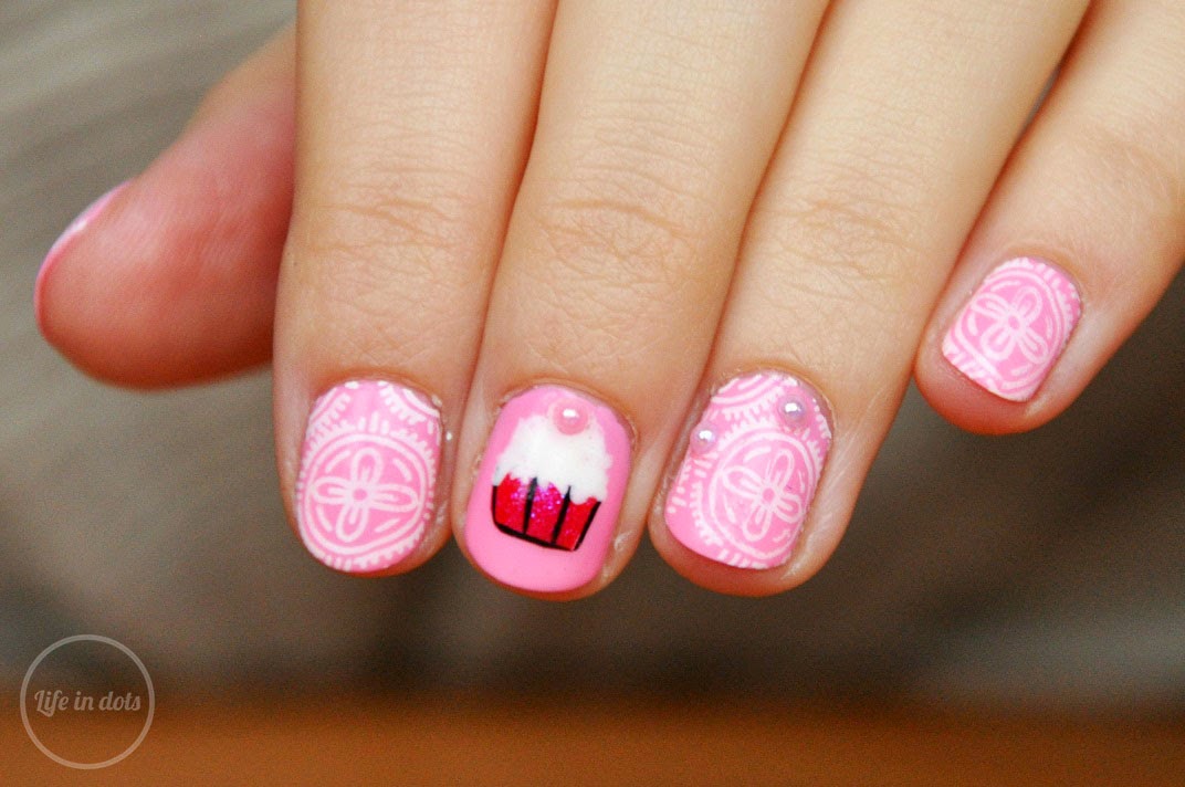 Kolejny tydzień projektu u Zakochanej minął. Tym razem tematem była stylizacja dla Pani Mikołajowej. I tutaj miałam problem. Najpierw chciałam postawić na seksowną Mikołajkę z czerwonymi paznokciami. Potem zastanawiałam się nad bałwankowo-elfimi motywami. Ostatecznie wpadłam na inny pomysł, który muszę Wam przedstawić, żeby całe zdobienie miało sens. Wyobraziłam sobie Panią Mikołajową jako taką dobrą duszę, która kocha świąteczne wypieki i zasypuje nimi męża i jego pomocników. A jak wypieki, to ciasta, torty, ciasteczka i muffinki! Najlepiej lukrowane. Dlatego moje paznokcie to takie śmieszne lukrowane babeczki, do czego nawiązuje zdobienie na lewej dłoni. Moja Pani Mikołajowa to czarodziejka w kuchni ;)