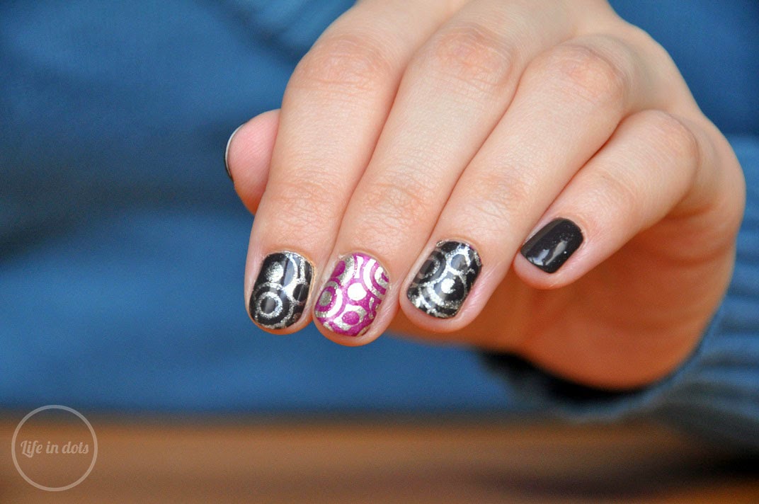 Bez zbędnych przedłużających wstępów. Dzisiaj chciałabym Wam przestawić kolejny manicure wykonany w ramach współpracy ze sklepem Born Pretty Store. Do jego wykonania użyłam lakieru Kiko o numerze 515, Essie Jiggle Hi Jiggle Low oraz Golden Rose Rich Color 31. Jako ozdobnik posłużyła mi płytka do stemplowania BP-21. W przeciwieństwie do moich pozostałych płytek ta jest okrągła i zawiera 4 większe wzory, które tworzą razem koło. Płytka przychodzi jak zwykle zabezpieczona niebieską folią, którą łatwo i skutecznie się odrywa. Elementy wzoru są bardzo starannie wycięte, więc łatwo przenosi się go na paznokieć. Jeżeli chcielibyście zakupić tę albo inne płytki z oferty BPS mam dla Was 10% zniżki z kodem HRL91. Konkretnie i na temat, ale na potwierdzenie swoich słów mam zdjęcia ;)