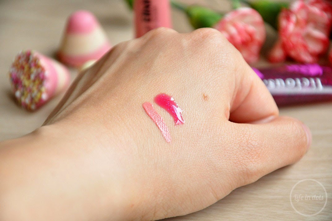 Colour Elixir 02 wpadł mi w ręce przypadkiem, w Biedronce, w której niedawno pojawiła się szafa kosmetyczna. Wybrałam neutralny beżowo-różowy odcień, o który wychowawczyni w klasie pewnie by nie krzyczała. I znowu najlepsza rzecz to zapach, chociaż tym razem przypomina gumę balonową z Kaczorem Donaldem, którą za parę groszy wygrzebywałam z pojemniczka w szkolnym sklepiku. Pomadka czy płynny lakier do ust (tak twierdzi producent) ma dość gęstą i kleistą konsystencję, którą nie da się w pełni pokryć ust przy pierwszym pociągnięciu. Może to słaba pigmentacja, może ta konsystencja, a może takie było zamierzenie, ale dopiero kilka dokładek pozostawia na ustach bardziej widoczną warstwę koloru z lepkim połyskiem. Pomadka delikatnie zasycha na ustach, ale nie na tyle by być trwałą. Ani jedzenia ani picia nie jest w stanie przetrwać, a zbyt duża ilość słów na minutę też jej szkodzi.