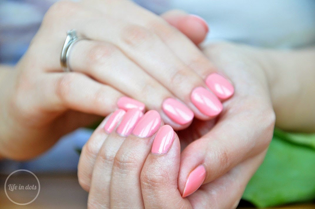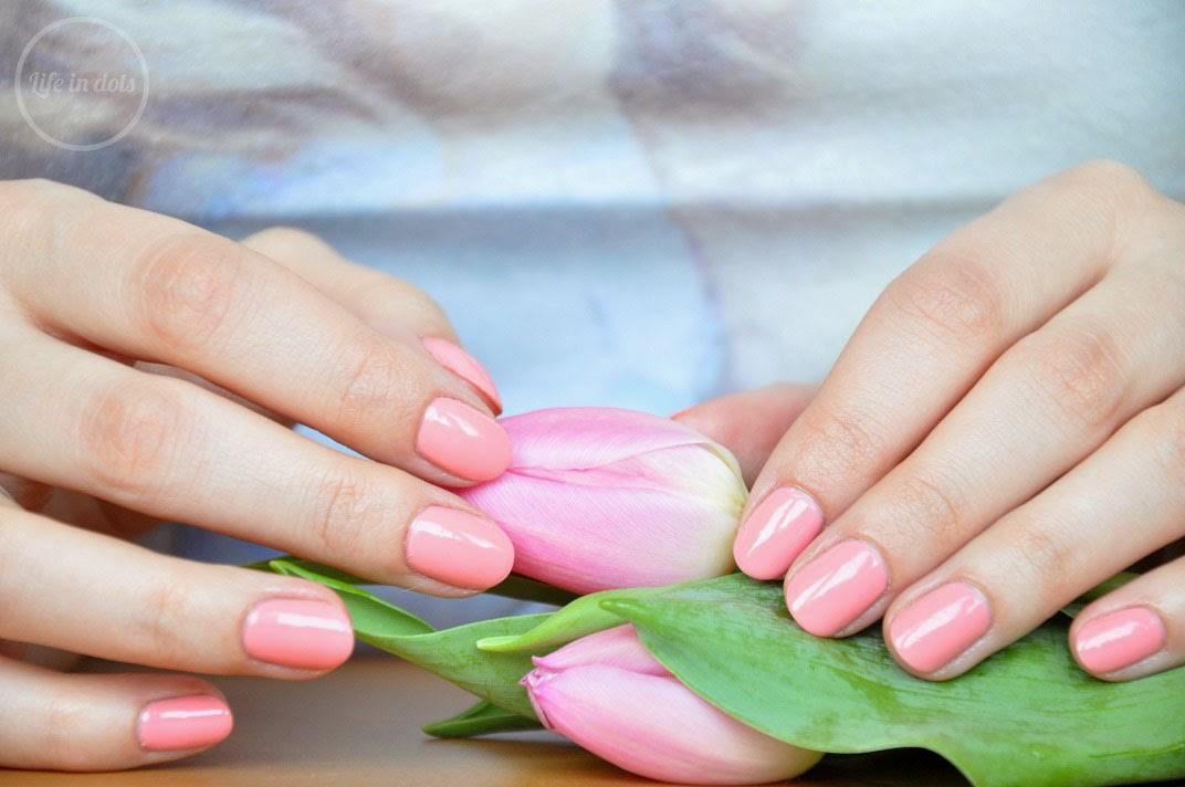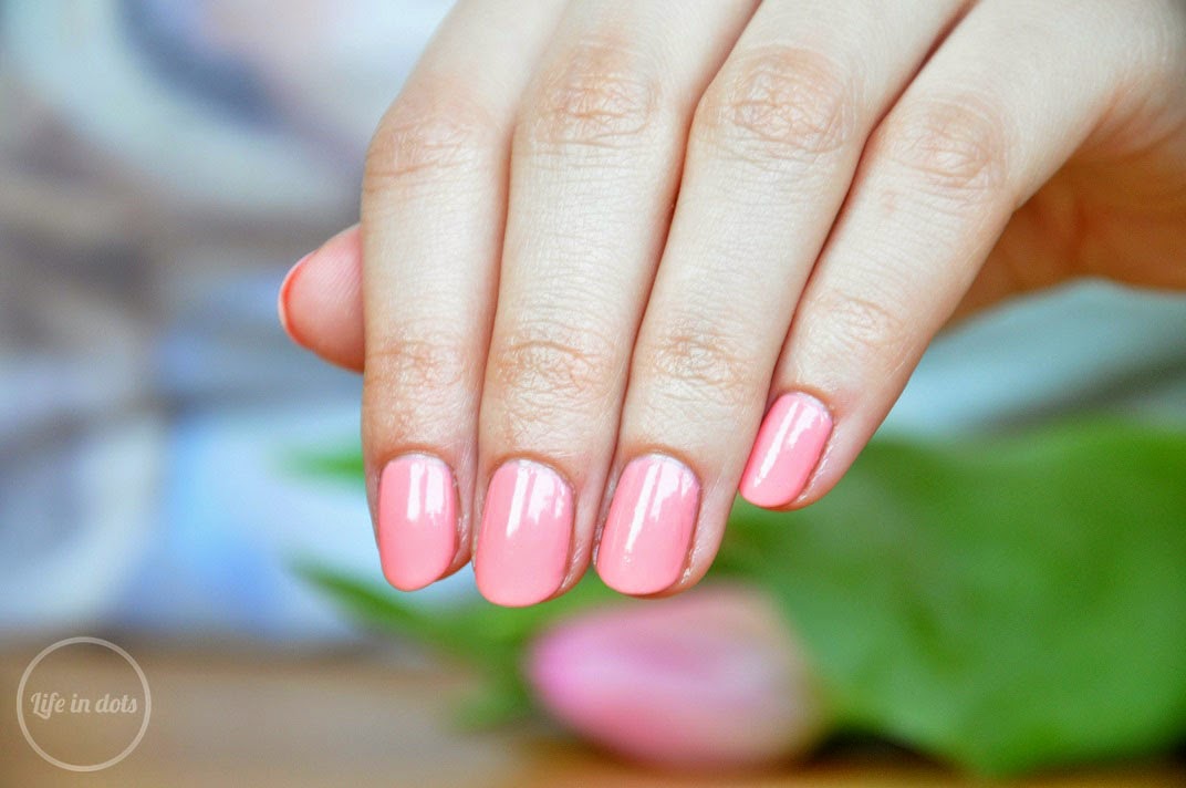 Kolor Cotton Candy odpowiada nazwie - słodki jak wata cukrowa. Na paznokciach prezentuje się bardzo elegancko, ale z dziewczęcą i zabawną nutą. Nie nudzi beżowymi, szarawymi podtonami, ale nadaje dłoniom odrobinę romantyzmu i subtelności, dzięki połączeniu różu i brzoskwini. Taki odcień sprawdzi się idealnie dla kobiety w każdym wieku, na każdej długości paznokci i praktycznie na każdą okazję, od pierwszej randki po oficjalne spotkanie. Lakier jest dość rzadki, ale dobrze kryjący, więc wystarczą dwie warswy aby pozbyć się prześwitów i początkowych niedociągnięć. Kremowe, delikatnie błyszczące wykończenie, które otrzymujemy dzięki szybkiemu wysychaniu pogłębia elegancję tego odcienia.