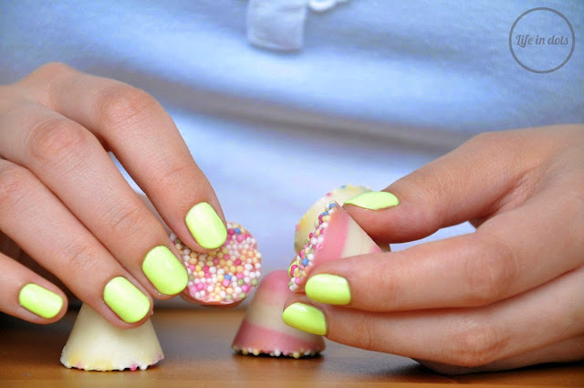 Key Lime Twist to bardzo kremowa limonka o intensywnym odcieniu. Zwraca na siebie uwagę zarówno w świetle dziennym jak i w ultrafiolecie na imprezie, gdy paznokcie zaczynają wręcz iskrzyć. W cieniu bardziej intensywna zieleń, w słońcu bardziej przytłumiona żółć. Chociaż chciałabym powiedzieć, że jest to neon w czystej postaci, to nie mogę przez delikatną domieszkę bieli, która dodaje subtelnej pastelowości temu odcieniowi. Kojarzy mi się z cukierkami, śmiesznymi kolorowymi lodami w zoo i oczywiście moim ślubem cywilnym! A do tego dłonie wzbudzają emocje nawet wśród nieznajomych, którzy pytają co to za odcień. Cuda na kiju zaczynają się dziać, gdy mam ten odcień na paznokciach. Nie dziwię się więc, że cała polska blogosfera oszalała na jego punkcie, bo nie dość, że krzykliwy to jeszcze wygląda jak obłędna wręcz hybryda. Chociaż potrzebuje do krycia dwóch grubszych albo trzech cieńszych warstw, a w trakcie rozprowadzania trzeba być uważnym, bo potrafi smużyć, to po zachnięciu na błysk daje efekt sztucznych paznokci. Tylko dla zachowania tradycji nałożyłam na niego topa, bo trwałość ma również zachwycającą - 7 dni z lekkimi pajączkami na najczęściej używanych paznokciach.