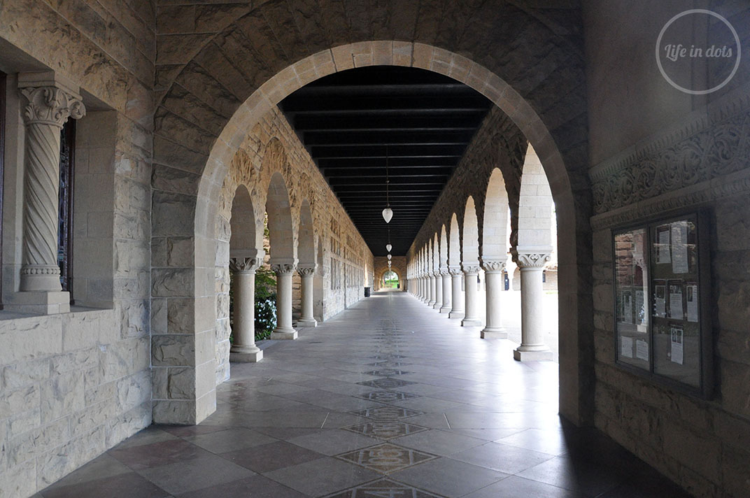 Uniwersytet Stanforda odwiedziliśmy w trakcie pobytu w Kalifornii trochę z tak zwanego “braku laku” i chęci spożytkowania kilku godzin przed wieczornymi atrakcjami. Spodziewając się uczelni przypominającej trochę Harvard albo MIT, które znajdują się na stosunkowo niewielkiej powierzchni, nawet się nie zorientowaliśmy, kiedy wjechaliśmy na ogromny kampus Stanforda. Dopiero znaki na drogach i miły pan w Visitors Center poinformował nas, że do zwiedzenia uczelni potrzebujemy przewodnika, albo przynajmniej mapy, na której zaznaczył nam najciekawsze miejsca – Hoover Tower oraz Main Quad z Memorial Church, a także budynek, w którym znajduje się pierwszy serwer Google.