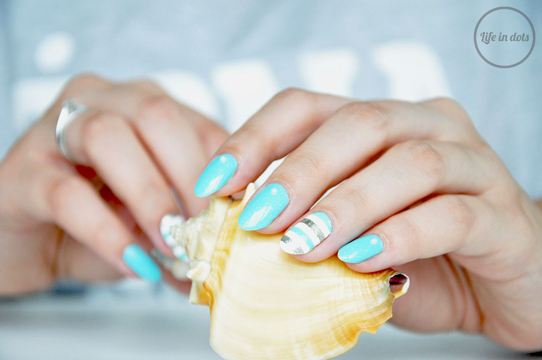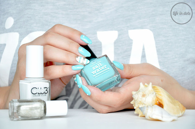 Zdobienie jest bardzo proste. Na wszystkie paznokcie oprócz serdecznych nałożyłam Salt Water, na który przykleiłam pojedyncze białe perełki. Na pozostałe nałożyłam biały lakier Color Club French Tip oraz szybkoschnący top, który posłużył mi jako baza do naklejania w równych odstępach paskowych naklejek winylowych. Sondą nałożyłam na zmianę Salt Water i metaliczny Jiggle Hi Jiggle Low.