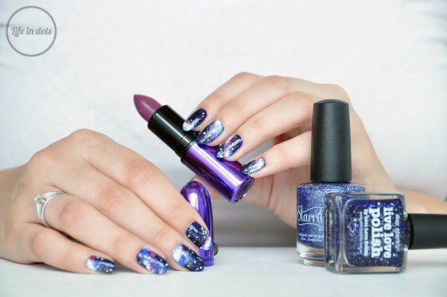 Do wykonania swojej wersji Galaxy Nails wykorzystałam wspomniany wyżej lakier Picture Polish o nazwie Live Love Polish. Pokryłam nim paznokcie w formie bazy, a następnie podartą gąbką do makijażu naniosłam na wyschniętą bazę kolorowe lakiery: biel Color Club French Tip, niebieski Essie Butler Please, malinowy Essie Berried Treasures oraz fiolet Golden Rose Rich Color numer 31. Gdy osiągnęłam zadowalający efekt kolorystyczny w wybranych miejscach dostemplowałam trochę brokatu z lakieru Starrily Orion’s Belt. Następnie dodałam sondą kilka białych kropek imitujących gwiazdy. Całość wygładziłam i utwardziłam dwiema warstwami lakieru nawierzchniowego.