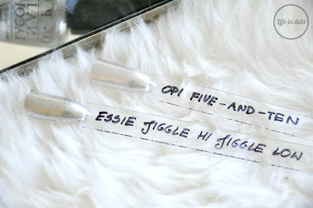 A jak Five-and-Ten wypada na tle mojego ulubieńca Jiggle Hi Jiggle Low Essie? Jak widać na zdjęciach efekt jest bardzo podobny z tym, że OPI jest odcieniem zimnym, zaś Essie to bardziej żółtawo-ciepłe srebro. Ten drugi ma również znacznie bardziej widoczne drobinki i trudniej rozpracować smugi pozostawione przez pędzelek, co związane jest z bardziej kremową konsystencją. Oba kolory mi się bardzo podobają, ale Essie wygrywa pod względem właściwości. Konsystencja jest lepsza, łatwiejsza do opanowania, pigmentacja jest znacznie mocniejsza, a czas schnięcia krótszy. To dalej świetne lakiery i spokojnie mogę stwierdzić, że Five-and-Ten to świetne zastęspstwo dla Essie.