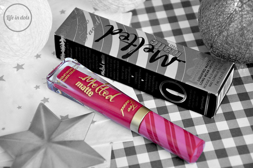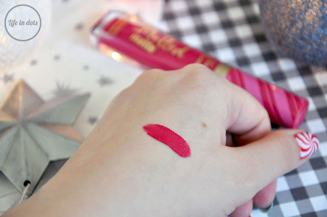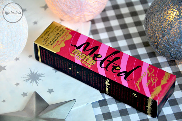 Pomadka ma kształt opakowania charakterystyczny dla matowej linii Melted marki Too Faced. Trapezowe przezroczyste plastikowe opakowanie ze złotymi napisami. W stosunku do klasycznej linii Candy Cane różni się kolorem nakrętki. Zamiast standardowego złota jest czerwień z różowymi paskami przypominający cukierek będący inspiracją dla stworzenia pomadki. Nie tylko kolor został zainspirowany, ale także zapach. Candy Cane pachnie bardzo intensywnie jak miętowe słodkie cukierki, które jadłam w dzieciństwie. Opakowanie ma 7 ml, została wyprodukowana w Stanach Zjednoczonych i jest ważna 12 miesięcy od daty pierwszego otwarcia. Podejrzewam, że nie przetrwa tyle ze względu na kolor.
