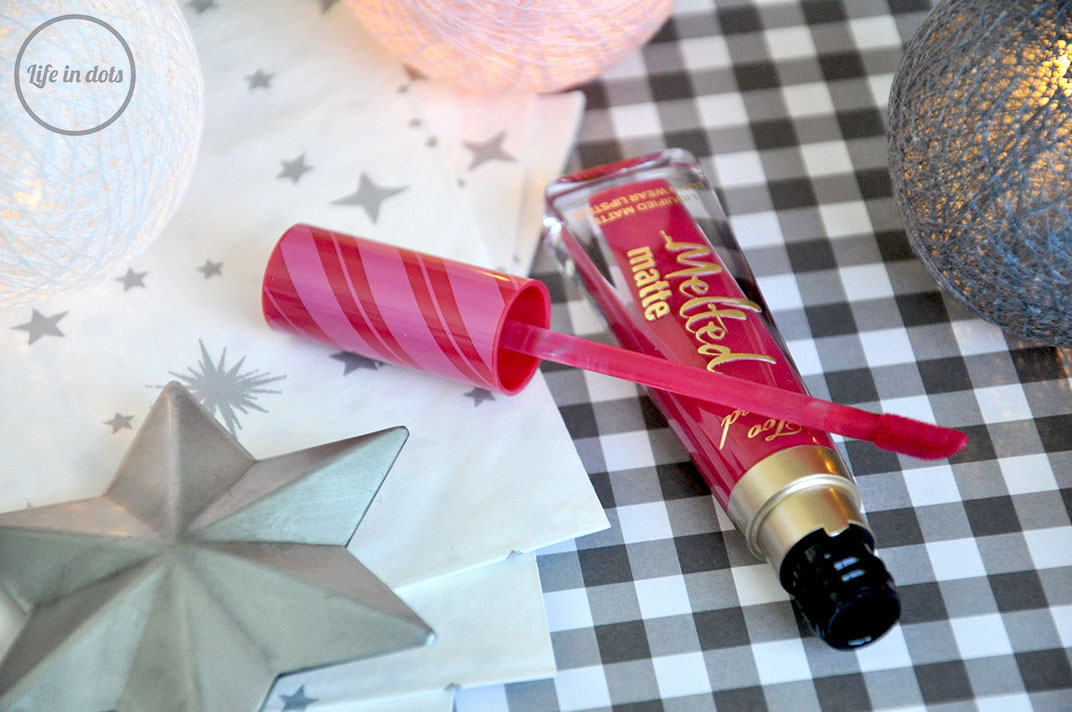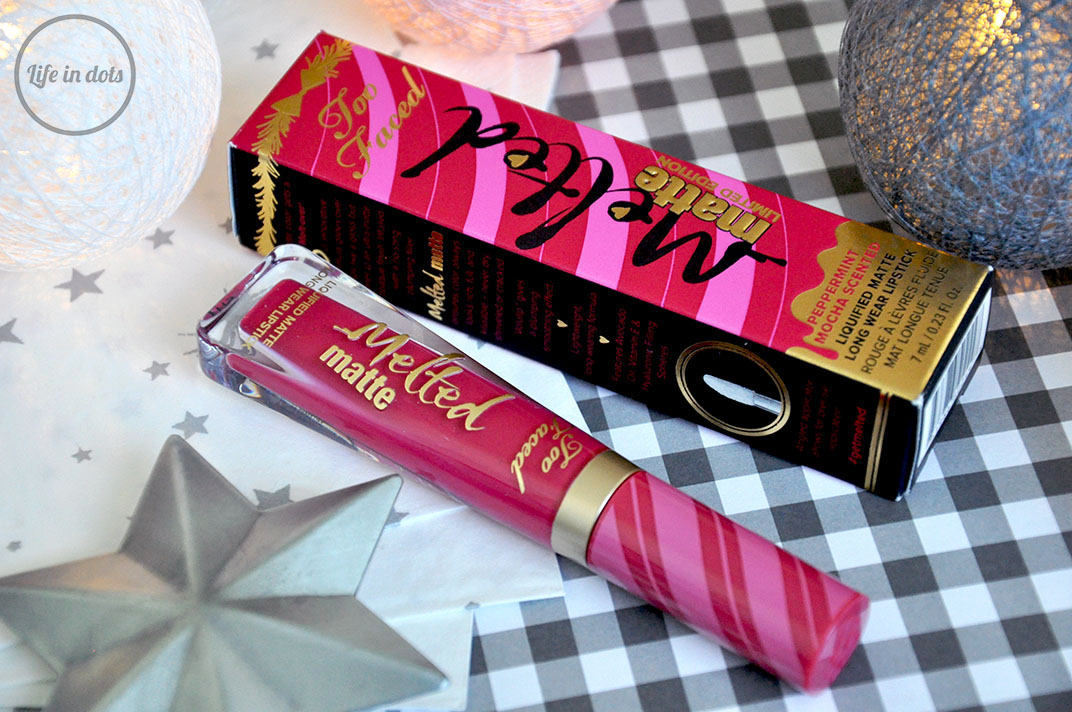 Świąteczne linie kosmetyczne mają to do siebie, że zawsze są piękne, urocze, kuszące i limitowane. Szczególnie można to odnieść do marki Too Faced, która w tym okresie przechodzi sama siebie tworząc produkty koło których nie można przejść obojętnie. Chociaż do palet cieni nie czuję specjalnej mięty (oprócz limitowanych Sweet Peach i White Chocolate Chip, które wykupiono zanim udało mi się kliknąć „do koszyka”), to miętowy cukierek w pomadkowej wersji mnie oczarował.