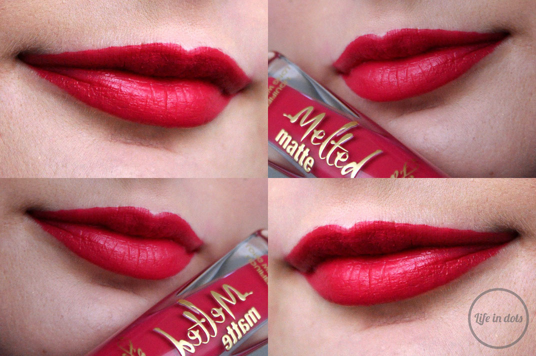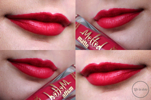 A jaki kolor! Fantastyczny, kremowy, intensywny. Odcień ten to czerwień smoothie z jagód. Połączenie maliny, truskawki i odrobiny jagód. Ciężko go określić jednoznacznie, bo jest naprawdę unikatowy. Najchętniej nosiłabym go codziennie, nawet do pidżamy. Wygląda przepięknie zarówno do mocniejszego smoky eye, jak i złotego codzienniaka, a także do makijażu typu „makeup no-makeup”. Candy Cane to neutralna tonacja, która ma w sobie wystarczającą ilość niebieskich tonów by wybielać zęby, a także odrobinę ciepłych, które pasują każdej karnacji i nie sprawiają wrażenia, że cera jest niezdrowa czy ziemista. Pod względem właściwości Melted Matte to marzenie. Klasyczny aplikator pięknie rozprowadza ten bardzo mocno napigmentowany produkt. Zgodnie z obietnica producenta, nakłada się komfortowo jak błyszczyk Da się to zrobić bez konturówki, co możecie zobaczyć na moich zdjęciach, jednak polecałabym obrysowanie konturu ust, żeby ułatwić sobie aplikację i sprawić by brzegi były ultra równe i idealnie wyrysowane. Początkowo Melted Matte jest satynowa, jednak po kilku chwilach zasycha na mocny mat z odrobiną miękkiego wykończenia „velvet”. Muszę jednak zwrócić uwagę na fakt, że na nie do końca czystych ustach, na których są resztki pomadki nawilżającej albo Glamglow Plumprageous, kolor może delikatnie się przenosić przy dotyku. Z konturówką jest nie do ruszenia. I to dosłownie. Trzyma się na mur beton kilka godzin, a przy demakijażu nie da się go usunąć bez olejku. Mogłoby się wydawać, że taka trwała matowa pomadka mocno wysusza usta, ale nie jest to prawda. Oczywiście skóra jest zmęczona po całym dniu noszenia, pomimo faktu, że pomadki praktycznie nie czuć, ale nie jest to nadmierne przesuszenie.