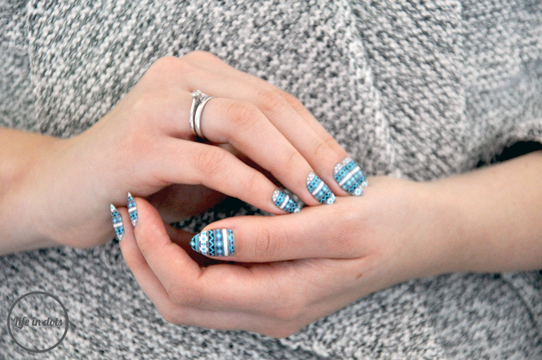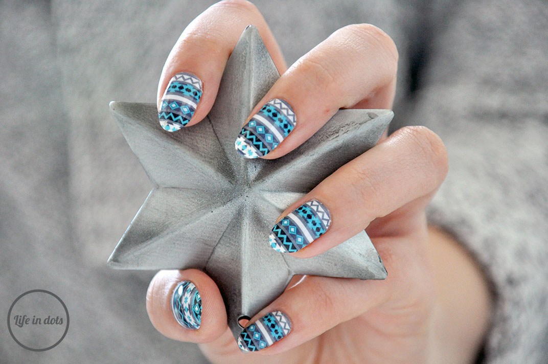 Był już Vlogmas, był już Blogmas, nadszedł czas na Nailmas! I to w moim wydaniu. Przez kolejne 24 dni będę codziennie publikowała świąteczne zdobienia na paznokciach. Podekscytowani? Bo ja bardzo! Zacznijmy jednak na spokojnie od prostych naklejek wodnych, które znalazłam na WhatsUp Nails. Niebieski sweterek przypomina azteckie wzory i jako, że jest to naklejka na cały paznokieć, to jest bardzo prosta w aplikacji. Nie muszę chyba tłumaczyć jak to się robi?