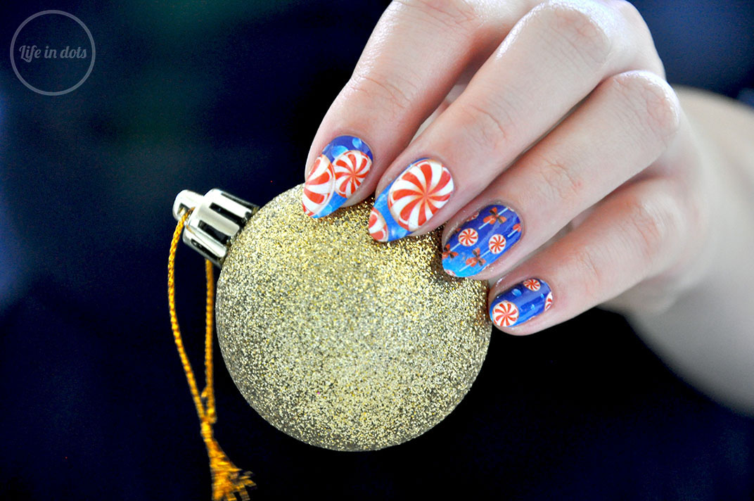Motyw cukierków o smaku mięty pieprzowej już się pojawił, bo nie da się ukryć, że to najpopularniejsze świąteczne cuksy w Ameryce. Pokazywałam już jak można stworzyć na paznokciach proste zdobienie z motywem „peppermint swirls” za pomocą płytki do stemplowania. Tym razem mam wersję dla leniuszków – naklejki wodne z Whats Up Nails!
