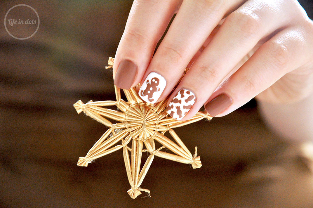 Pierniczki to najpopularniejsze świąteczne ciastka w Polsce. Ja znam je pod postacią gwiazdek i choinek z lukrem i posypką, ale występują chyba we wszystkich kształtach i kombinacjach. Również w wersji ludzika (Wam też kojarzy się to ze Shrekiem?), którego stworzyłam na swoich paznokciach w towarzystwie karmelowych cukierków.