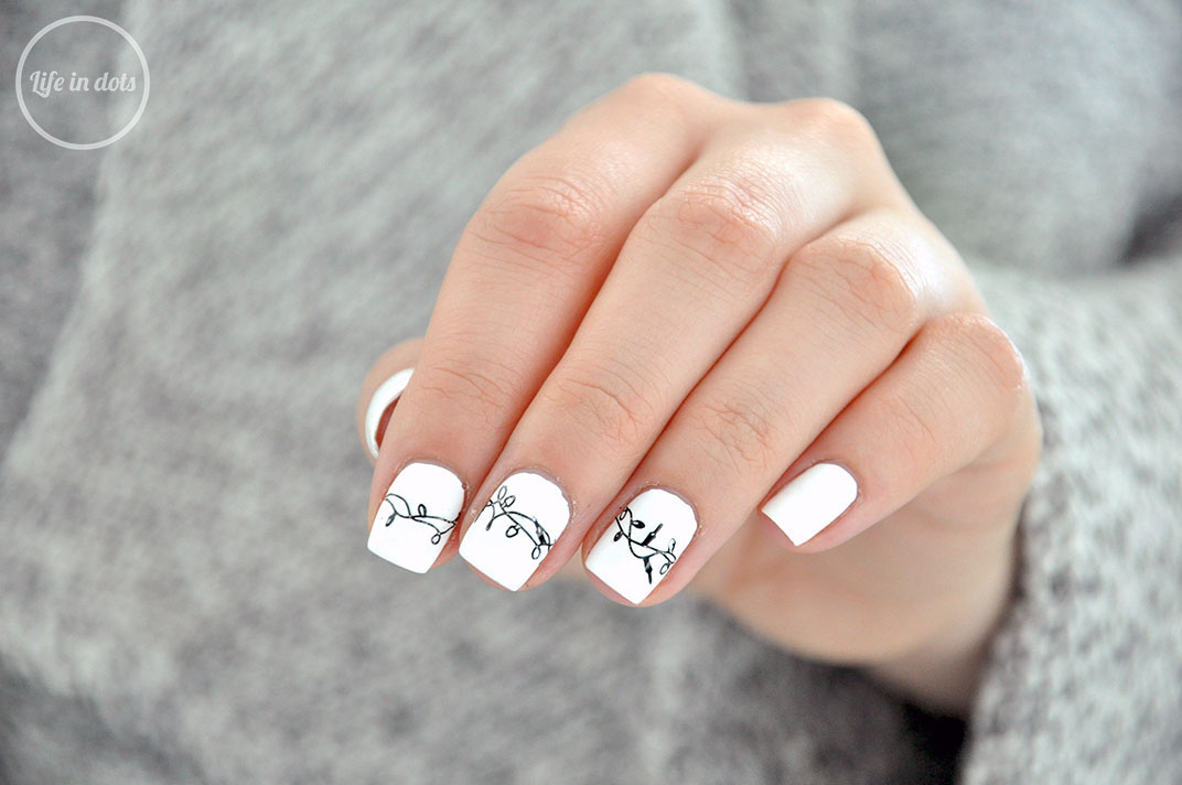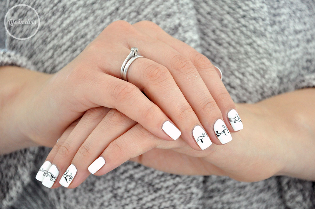 Do zrobienia tego manicure wystarczą dwa lakiery i zestaw do stemplowania z płytką Festive 17 MoYou London. Jako bazę standardowo wykorzystałam biały lakier Color Club French Tip, a zdobienie wykonałam czernią MoYou London Black Knight. Na wyschniętą bazę po prostu stemplowałam wzór lampek choinkowych, który następnie utrwaliłam lakierem nawierzchniowym.