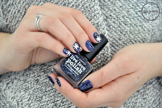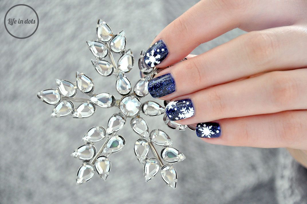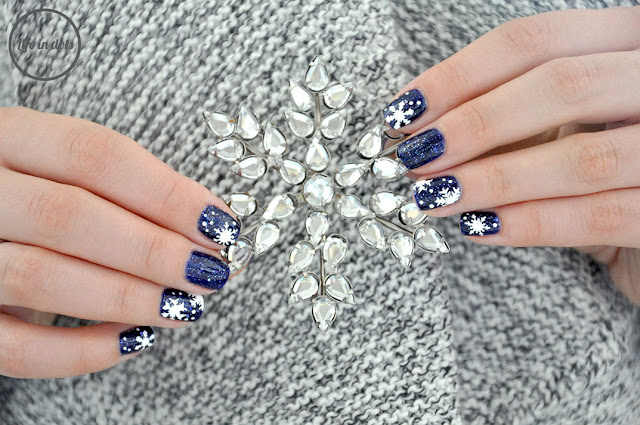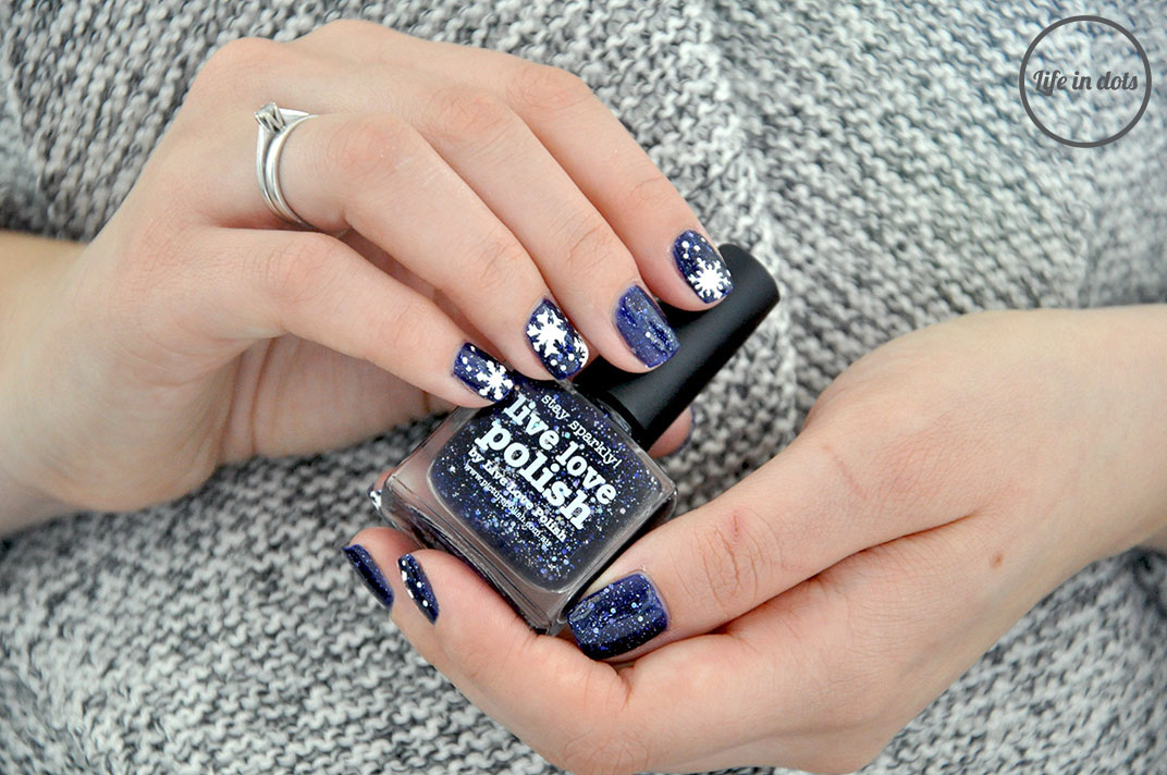 Chociaż bardzo efektowne, to zdobienie jest jednak bardzo proste. Wystarczy ciekawy lakier bazowy w odcieniach granatu, biały lakier i naklejki winylowe. Ja zdecydowałam się na lakier Picture Polish o nazwie Live Love Polish, który pokazywałam już przy okazji Galaxy Nails. To naprawdę przepiękny, głęboki odcień z dużą ilością srebrnego brokatu i holograficznych „piegów”. Paznokcie pokryte kolorem bazowym pokryłam szybkoschnącym lakierem, a po kilku minutach nakleiłam na nie naklejki winylowe w kształcie śnieżynek, które wypełniłam białym lakierem. Naklejki szybko oderwałam i sondą zrobiłam kilka białych kropeczek dla uzyskania ciekawszego efektu. Całość utrwaliłam lakierem nawierzchniowym.