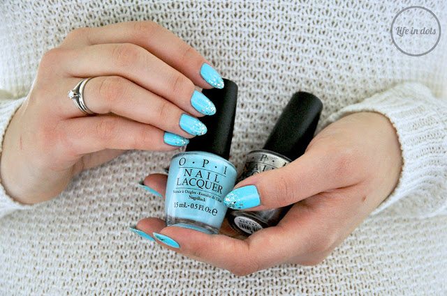 Manicure jest bardzo prosty, bo wystarczy do niego dowolny kolor lakieru bazowego oraz brokat w każdej postaci. Ja zastosowałam OPI I Believe in Manicures i wyciągnięte z czeluści szafki topy Essence i Catrice z holograficznymi „piegami” i różnymi drobinkami. Można posłużyć się jednym takim lakierem, jednak ja dla urozmaicenia efektu wykorzystałam 3 różne. Na początek pokryłam takim topem pół paznokcia, następnie kolejnym 1/3 powierzchni paznokcia, a ostatnim 1/4 płytki. Tak samo można to zrobić z sypkim brokatem. Trzeba jednak pamiętać o cienkich warstwach, które ładnie będą się przenikać aż do osiągnięcia prawie pełnego krycia na końcu paznokcia. Takie stopniowe malowanie co raz mniejszej powierzchni daje bardzo prosty efekt ombre.