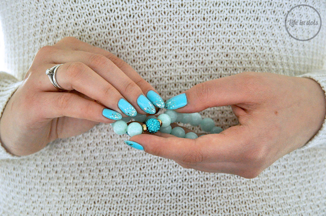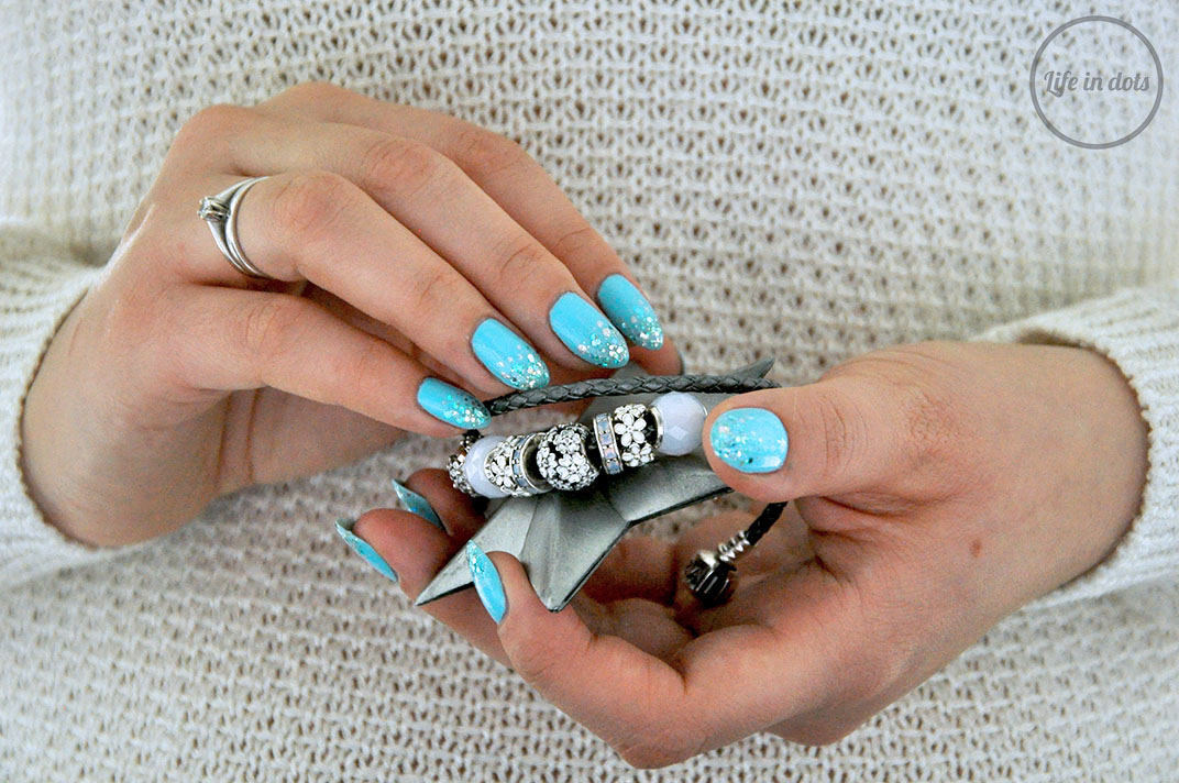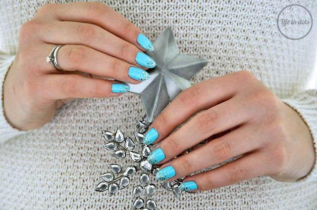 Muszę się przyznać, że jestem sroką. Lubię błyskotki, brokaty, metaliczne i lustrzane efekty, cekiny, złotka, sreberka oraz inne dziwne babskie dekoracje. W okresie przedświątecznym dzieje się ze mną coś takiego, że cała oblekłabym się w brokat. Zaczęłam jednak od paznokci tworząc coś na kształt oszronionego manicure Królowej Lodu.