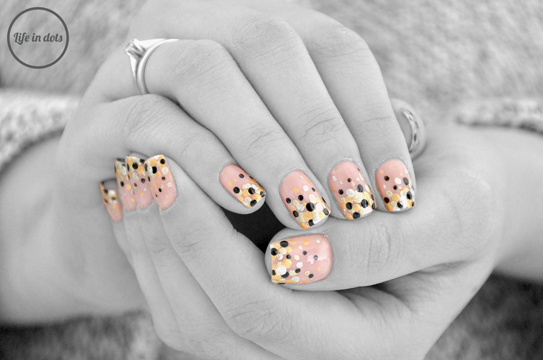 Zamysłem tego dotticure są kropki, które tworzą na paznokciach gradient. Do stworzenia tego zdobienia wybrałam kolory z jednej gamy i kontrastową czerń. Metaliczne srebrno i złoto to trzy lakiery: Essie Jiggle Hi Jiggle Low, Catrice 03 Piece of Forever oraz MoYou London Liquid Gold. Czerń to standardowo Golden Rose Color Rich w odcieniu 31. Oprócz lakierów potrzebne jest też narzędzie do robienia kropek, może to być sonda, wsuwka z okrągłym zakończeniem albo wykałaczka. Ja wybrałam wsuwkę, którą robiłam kropki zaczynając od najjaśniejszego odcienia. Zaletą tego zdobienia jest fakt, że nie trzeba się starać. Kropki można dowolnie rozmieścić w absolutnie każdej kombinacji kolorystycznej. Ten manicure nie może się nie udać, po prostu.