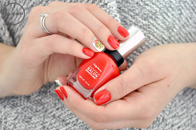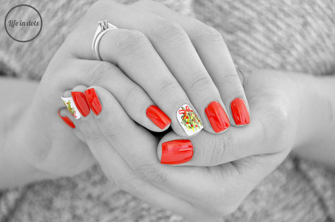 Świąteczne manicure jest bardzo proste do wykonania i bardzo efektowne. Wykorzystałam klasyczną czerwień Sally Hansen 550 All Fired Up, a na palcach serdecznych jako bazę pod zdobienie biel Color Club French Tip. Do stworzenia jemioły potrzeba kilka odcieni zieleni w formie lakieru lub farby akrylowej i czerwień. Ja wykorzystałam dwa lakiery, z których stworzyłam 3 odcienie: OPI Suzi – The First Lady Of Nails oraz Golden Rose Color Rich o numerze 36. Na początek namalowałam kilka gałązek oboma kolorami, a potem mieszanką stworzyłam malutkie listki. Na tym czerwoną farbką akrylową zrobiłam kilka punktów imitujących owoce jemioły oraz czerwoną wstążkę. Całość utrwaliłam.