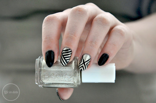 Bardzo prosty w wykonaniu manicure, który ujarzmia połysk na paznokciach. Na czarnej bazie z lakieru Golden Rose Rich Color numer 31 stworzyłam wzór z paseczków. Osobiście trochę oszukałam, bo posłużyłam się naklejkami winylowymi, które pomogły mi uzyskać proste linie, ale spokojnie da się to zrobić zwykłym cienkim pędzelkiem. Jako metaliczny lakier posłużył mi jak zwykle Essie Jiggle Hi Jiggle Low. Jak wykonać zdobienie z naklejkami? Kolorową bazę należy utwardzić szybkoschnącym lakierem nawierzchniowym, a następnie na suche paznokcie nakleić wybrane naklejki dokładnie dociskając, by nic nie odstawało. Tak przygotowane paznokcie należy pomalować warstwą mocno kryjącego brokatowego lakieru i szybko, ale uważanie oderwać. Wzór pozostanie w miejscach, które nie były przykryte naklejką.
