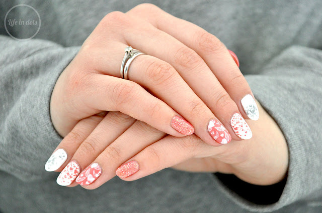 Postawiłam na proste wzory, pastelowe kolory i fantastyczną płytkę do stemplowania MoYou London Festive 20. Wybrałam trzy lakiery MoYou: White King, Teenage Blush i Silver Fox, do których dobrałam cudowny piaskowy lakier Zoya Pixie Dust Zooey, którym pokryłam dwa paznokcie dla dodania odrobiny błysku temu delikatnemu mani. Dwa paznokcie pomalowałam bielą, a jeden serdeczny różem. Następnie na wyschnięte kolory bazowe nastemplowałam wybrane wzorki przy pomocy bieli, różu i szarości. Całość porządnie utrwaliłam lakierem nawierzchniowym i voilà!