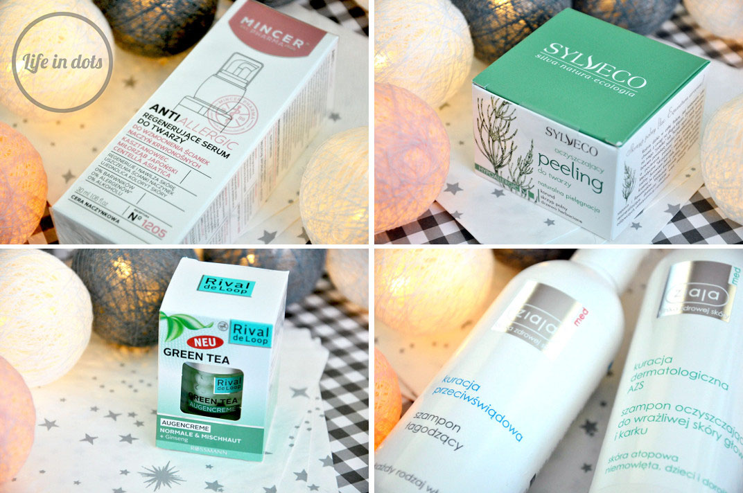 Korzystam z każdej okazji, by uzupełnić zapasy swojego ulubionego szamponu. Nie chodzi jedynie o przywiązanie, ale o jego zbawienne działanie na moją bardzo wrażliwą skórę głowy, która obarczona jest łojotokowym zapaleniem skóry. Szampon łagodzący Ziaja to mój święty graal i polecam go każdemu kto boryka się z problemami ze skórą głowy. Tym razem jednak, oprócz zapasu tego produktu, skusiłam się na szampon oczyszczający przeznaczony do pielęgnacji skóry z AZS. Może będzie to ciekawa alternatywa dla mojego ulubieńca. Na swojej liście zakupów od dłuższego czasu miałam również peeling Sylveco. Naczytałam się wiele dobrego o tych naturalnych produktach, a pomadka z peelingiem jest moją ulubioną, zdecydowałam się więc na zakup peelingu oczyszczającego przeznaczonego do skóry problematycznej. Nie tylko zaskórniki są moim problemem, ale również pękające naczynka, które co raz bardziej dają o sobie znać. Szukałam więc w sklepach serum przeznaczonego do pielęgnacji skóry naczynkowej i w oczy rzucił mi się produkt Mincer, który zdecydowałam się kupić ze względu na skład. W trakcie poszukiwań w oko wpadł mi również krem pod oczy Rival de loop, który ma bardzo ciekawą żelowo-kremową formułę. Ciekawy gadżet, chociaż nie jestem zachwycona jego działaniem. Nie sprawdza się do wieczornego nawilżania, ani pod makijaż, bo bardzo długo się wchłania. Cena też nie była najniższa jak na tę markę.