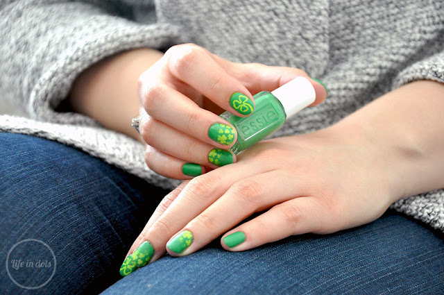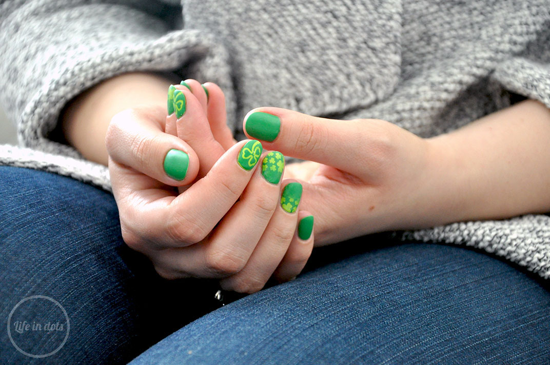 Do stworzenia tego manicure podchodziłam 3 razy za każdym razem uzyskując co raz gorszy efekt w różnych zwariowanych kombinacjach. Ostatecznie postawiłam na prostotę uzyskaną dwoma odcieniami zieleni i naklejkami winylowymi. Wybrałam ciemno-zielony Essie On The Roadie i bardziej neonowy MoYou Key Lime, z których stworzyłam ombre na palec serdeczny i środkowy, a także koniczynkę na placu wskazującym. Posłużyłam się w tym celu naklejkami winylowymi Whats Up Nails, które ułatwiły mi zadanie. Paznokcie bez zdobienia pokryłam lakierem Essie. Całość porządnie utrwaliłam lakierem nawierzchniowym, a następnie zmatowiłam lakierem Picture Polish g’day matte i voilà!