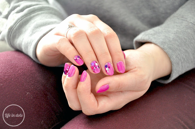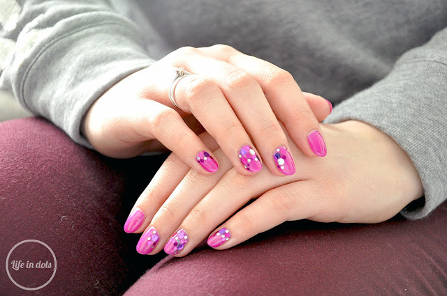 Pisząc „super proste” naprawdę, naprawdę mam na myśli coś niesamowicie prostego. Wręcz śmieszne prostego, bo każdy jest w stanie wykonać to „zdobienie. Wystarczy jeden odcień lakieru i modne ostatnio konfetti na paznokcie. Ja zdecydowałam się na przepiękny, delikatnie perłowy odcień fuksji o nazwie Paradise Cove z zeszłorocznej letniej kolekcji Orly, który skomponowałam z konfetti WhatsUp Nails o nazwie Berries Confetti. Efekt, który widać na zdjęciach uzyskałam układając kolorowe kółeczka w coś rodzaju ombre. Ot, cała filozofia. Całość porządnie utrwaliłam kilkoma warstwami lakieru nawierzchniowego i voilà!