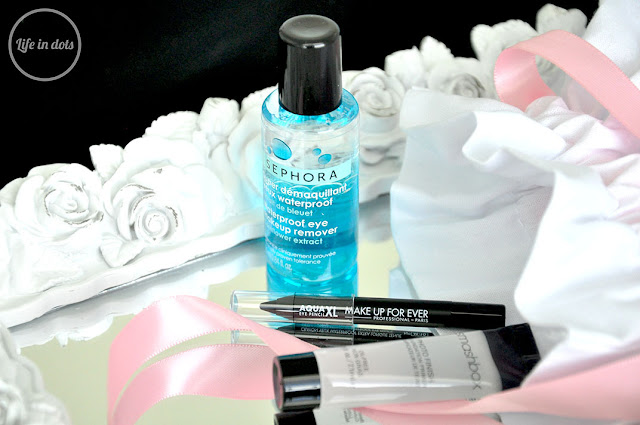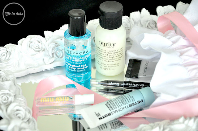 Nie wiem czy to ja stałam się tak wymagająca, czy to Sephora obniżyła jakość, ale na kwietniowym pudełeczku odrobinę się zawiodłam. O obecności kredki Make Up For Ever wiedziałam z wcześniejszych zapowiedzi w internecie, więc to mnie nie zaskoczyło. Zdziwienie moje wywołał fakt, że to najmocniejsza część pudełeczka. Wprawdzie w zestawie pojawiły się fantastycze kosmetyki zbierające pełno pozytywnych opinii, ale niestety powtarzające się w moich zbiorach miniatur. Podejrzewam, że zarówno Peter Thomas Roth jak i baza Smashbox powędrują do kogoś innego, kto nie miał styczności z tymi produktami. Cieszy mnie za to obecność miniaturowego płynu do demakijażu, bo przyda się w trakcie nadchodzących podróży. Pobawię się też trochę z próbką Miu Miu L’Eau Bleue, bo lubię zapach konwalii. Ot taka ta zawartość, trochę byle jaka.