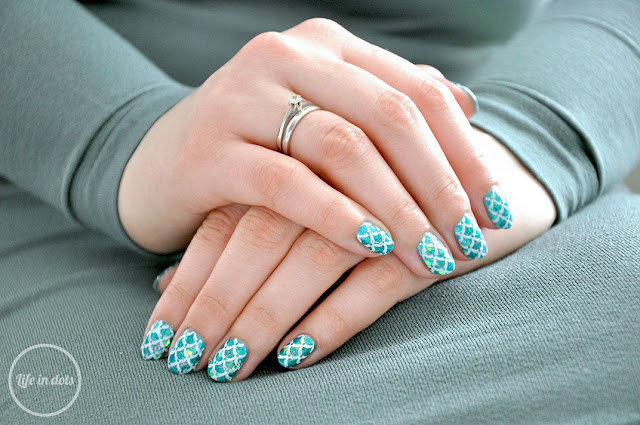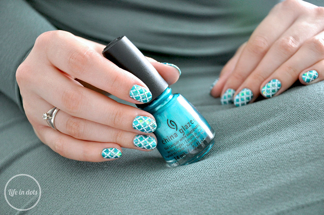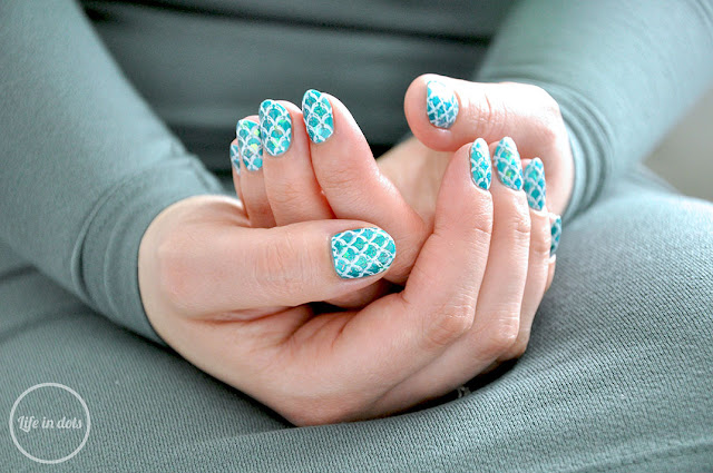 Bazą do zdobienia był przepiękny lakier w morskim odcieniu z wiosennej kolekcji China Glaze – Don’t Teal My Vibe. Jego metaliczne wykończenie idealnie skomponowało się ze wszelkiej maści holograficznymi pieguskami, niteczkami, sześcianami i niebiesko-białym brokatem, które nałożyłam na wierzch. Taką ilość zdobień przykryłam grubą warstwą lakieru nawierzchniowego. Następnie przy pomocy białego lakieru MoYou London White Knight, płytki Pro XL 02 i przezroczystego stempla stworzyłam syreni wzór na wierzchu. Całość ponownie porządnie utrwaliłam lakierem nawierzchniowym i voilà!