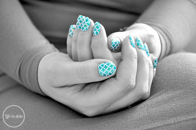 Niewielu z Was pewnie wie o tym, ale zanim założyłam bloga zajmowałam się stylizacją paznokci. Z tamtych czasów została mi pasja do zdobień i ogromna ilość wszelkiej maści brokatowych pierdółek i holograficznych cudów we wszystkich kształtach. Mam też kolorowe piórka do zatapiania w masie żelowej bądź akrylowej. Cudaki te zalegają w pudełku w szafie i tak sobie pomyślałam, że może rozweselę ozdóbki i siebie i upakuję je na paznokciach. W ten sposób powstał mój syreni manicure.