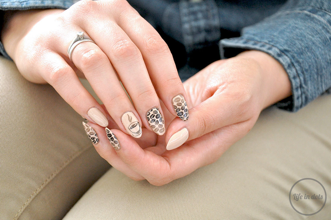Americanę bez mleka. Latte na migdałowym mleku. Espresso przedłużane wodą. Cafe con pana. Kawę, poproszę. Najlepiej dużą, pyszną, czarną i aromatyczną. O poranku, w południe, lub na wieczór. Uwielbiam kawę, jej kolor, zapach i smak. Uwielbiam też to, jak prezentuje się na paznokciach w tym kawowym zdobieniu.